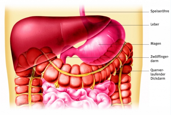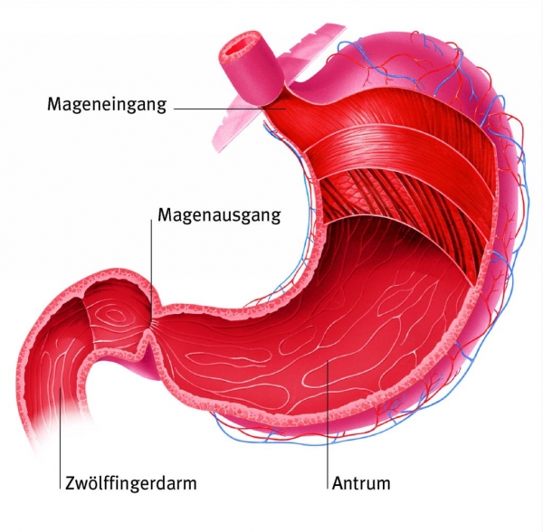 GasterAbschnitt des Verdauungstrakts zwischen Speiseröhre und Dünndarm, in dem die Nahrung vorverdaut und über den Pylorus kontrolliert an den Zwölffingerdarm weitergegeben wird. Die Magenschleimhaut produziert Salzsäure sowie Verdauungsenzyme und -hormone.