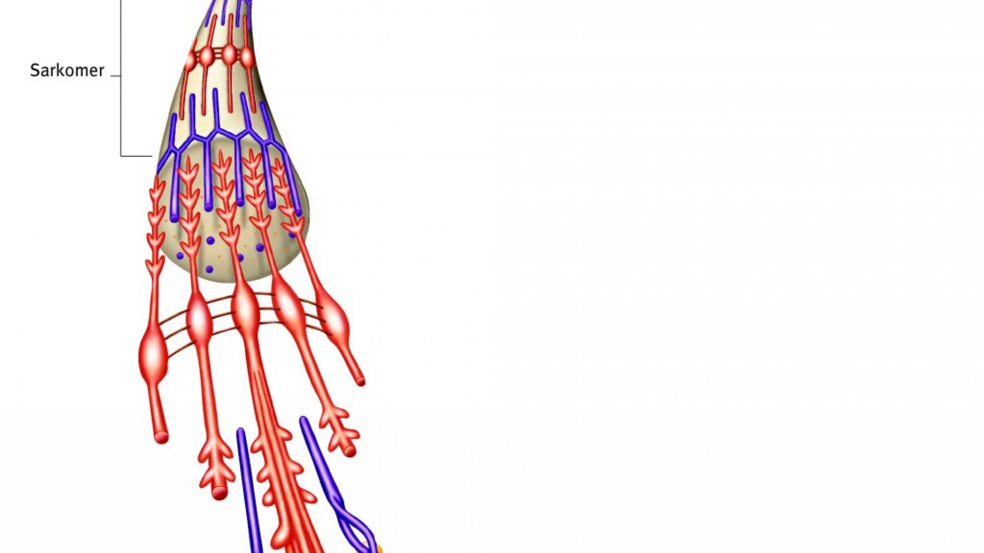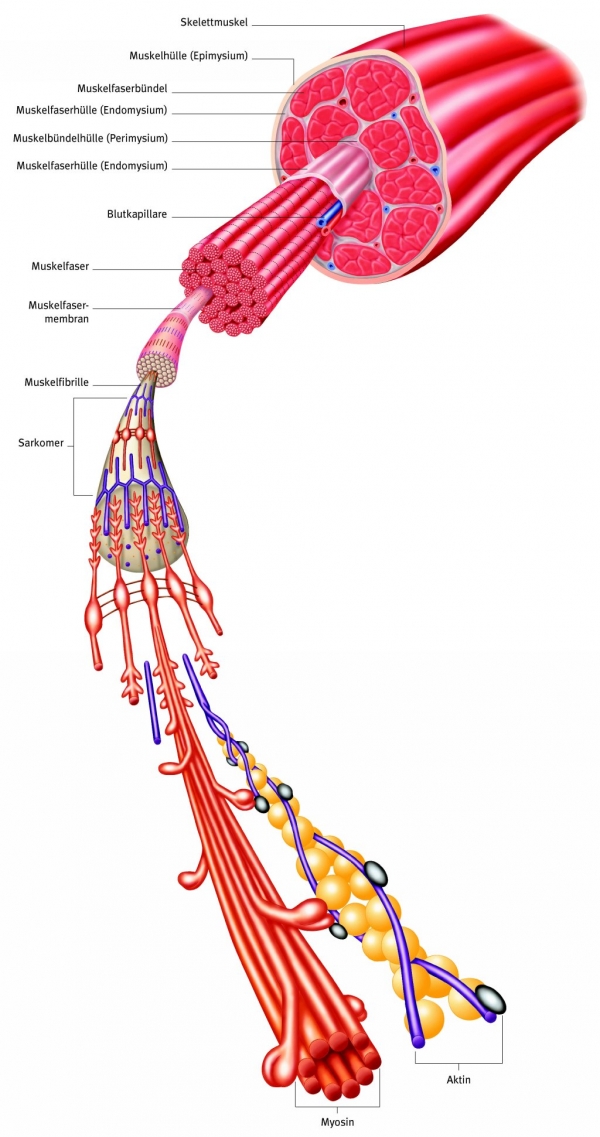 Muskelzellespezialisierte Zellen des Muskelgewebes mit mehreren Kernen, zahlreichen Mitochondrien und Myofibrillen als kontraktile Zellelemente. Manche Muskelfasern sind mehrere Zentimeter lang. Die Fasern der Skelettmuskeln werden über sog. motorische Endplatten innerviert. Ein Nervenimpuls löst einen intrazellulären Kalziumanstieg aus, der zur Kontraktion der Myofibrillen führt.