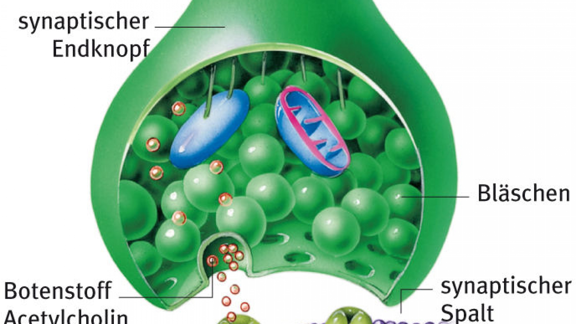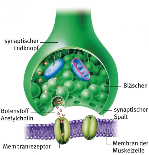Ursache der Muskelschwächekrankheit Myasthenie ist eine Störung der Impulsübertragung vom Nerv auf den Muskel. Der Botenstoff Acetylcholin, der von den synaptischen Endknöpfchen der Nervenfortsätze freigesetzt wird, findet normalerweise passende >Andockstellen< an der Muskelzelle, die so genannten Membranrezeptoren. Bei der Myasthenie sind diese Andockstellen durch Autoimmunprozesse zerstört, so dass die Muskelzellen nicht stimuliert werden.
