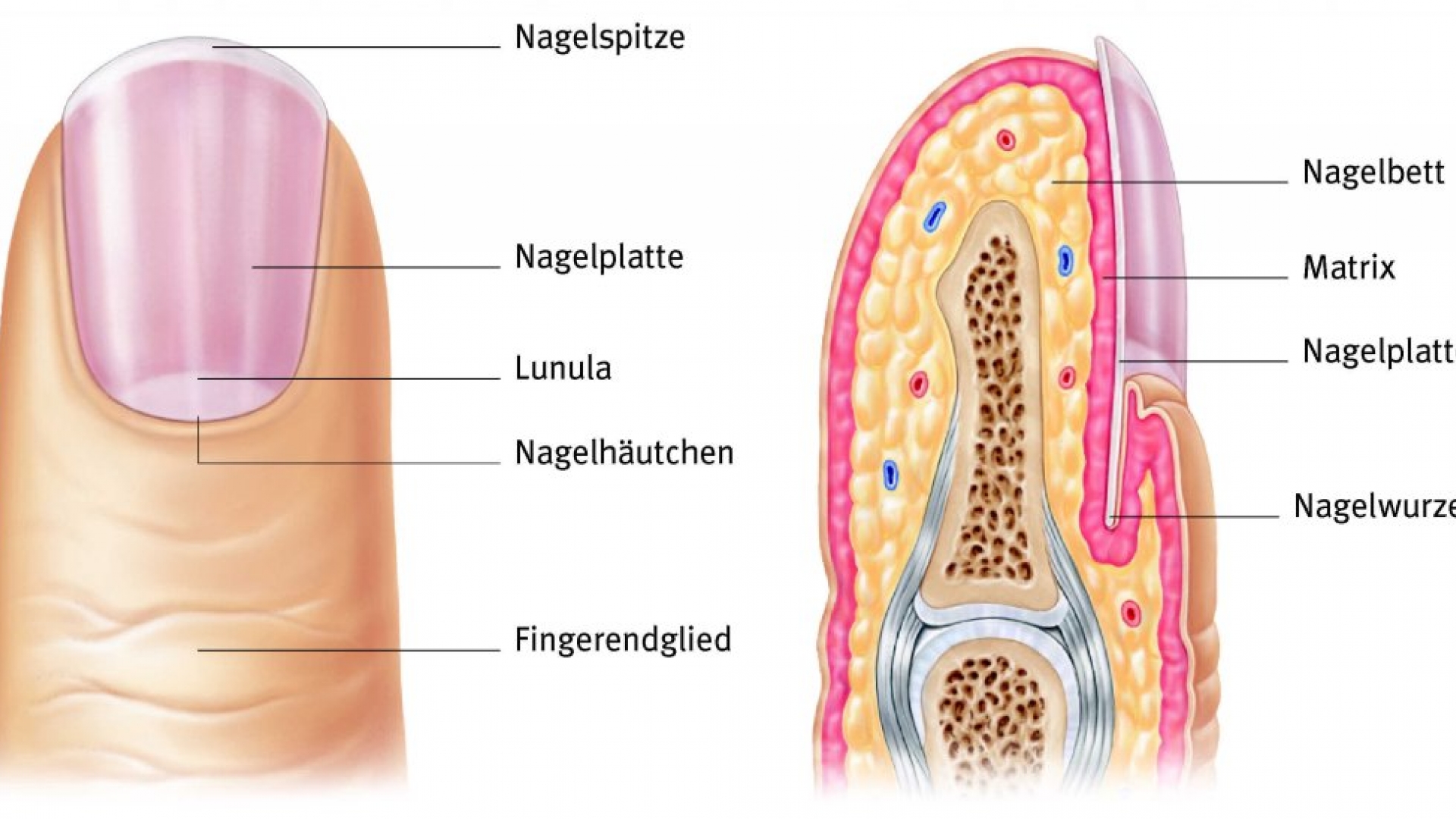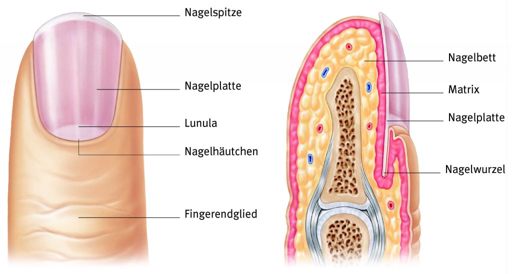 Unguis, Finger- oder Zehennagel, der dem Nagelbett als Hornplatte direkt aufliegt.