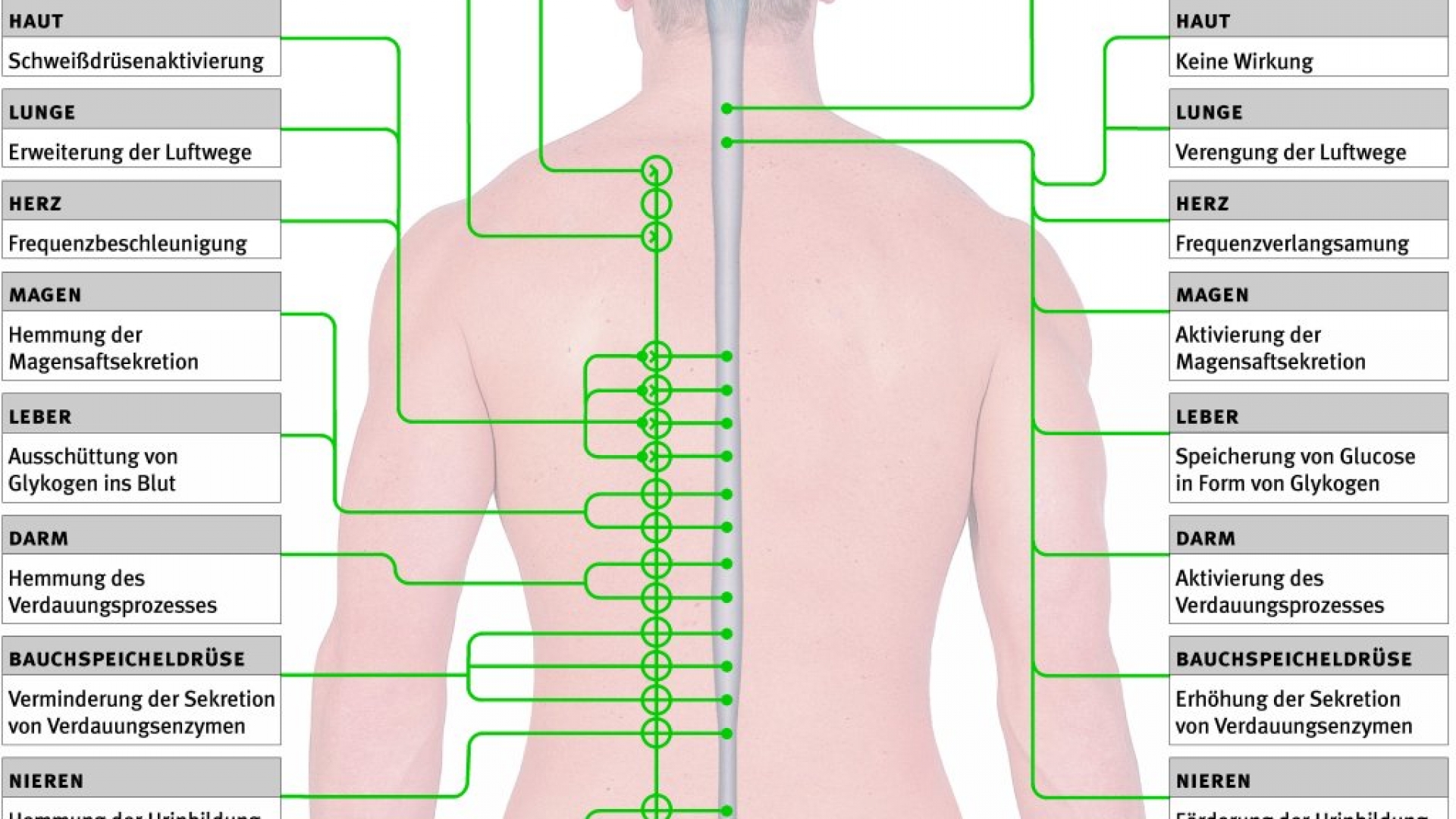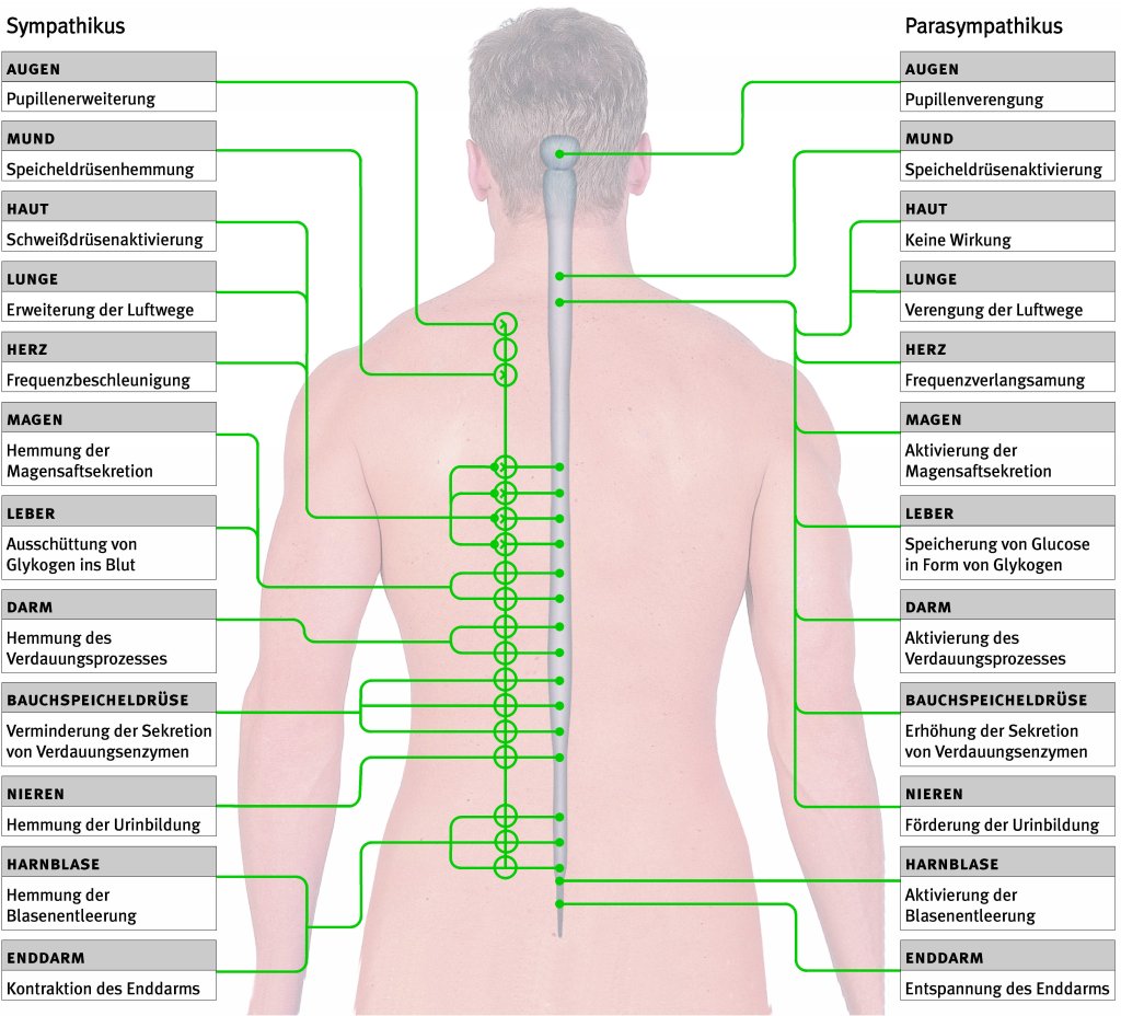 Sympathisches und parasympathisches Nervensystem bilden zusammen das vegetative Nervensystem. Die sympathischen Nervenbahnen führen vom mittleren Rückenmarkssegment, die parasympathischen vom Gehirn und dem unteren Rückenmarkssegment zu den einzelnen Organen. Generell erhöht der Sympathikus die Körperaktivität, während der Parasympathikus eher das Gegenteil bewirkt. Beide Systeme gleichen sich in ihrer Wirkung meist aus.