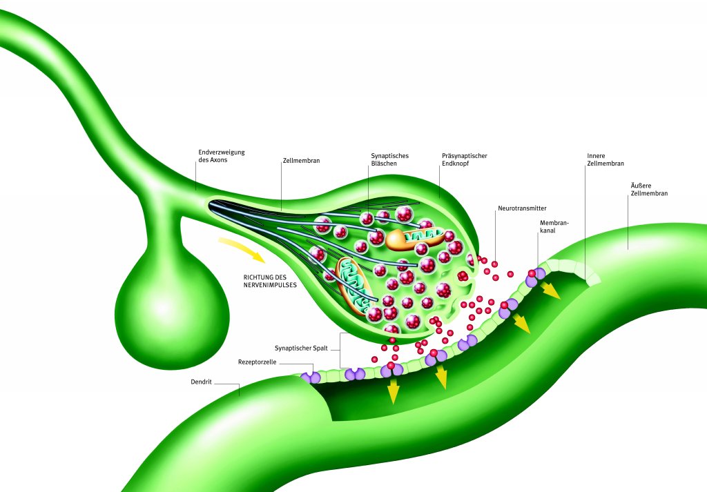 Nervenimpulse werden von chemischen Substanzen, den so genannten Neurotransmittern, ausgelöst. Bei jeder Stimulierung eines Neurons entsteht eine elektrische Ladung. Erreicht diese Ladung den präsynaptischen Endknopf, kommt es zur Ausschüttung von Neurotransmittern, die über den synaptischen Spalt hinweg zu den Rezeptoren eines benachbarten Neurons wanderen. Dieser ganze Vorgang dauert weniger als eine Millisekunde.