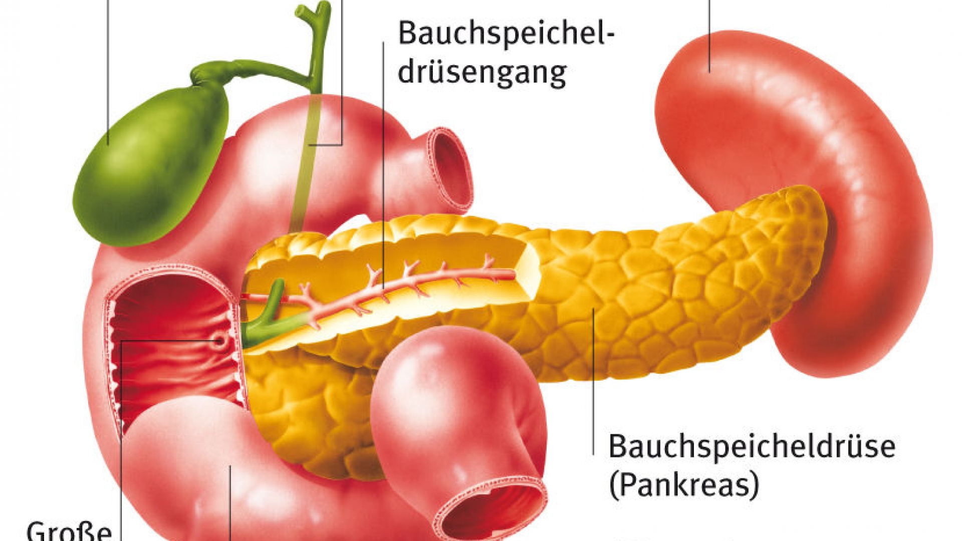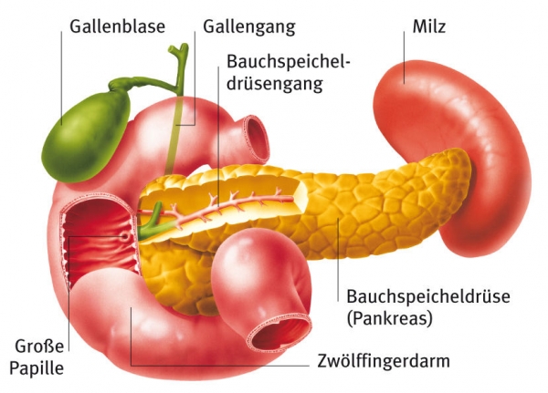 Pancreas; Bauchspeicheldrüsewichtigste Verdauungsdrüse des Menschen. Das etwa 20 Zentimeter lange und 80 Gramm schwere, in Läppchen unterteilte Organ liegt im Oberbauch hinter dem Magen quer vor der Wirbelsäule. Das Pankreas produziert täglich etwa 1,5 Liter Pankreassaft, der zahlreiche Verdauungsenzyme enthält und über einen Ausführungsgang in den Dünndarm abgegeben wird. Darüber hinaus liegen in der Bauchspeicheldrüse über das ganze Organ verstreut etwa eine Million gut durchbluteter Zellgruppen, die sog. Langerhans-Inseln, die zwei für den Kohlenhydratstoffwechsel wichtige Hormone produzieren, das Insulin und das Glucagon.