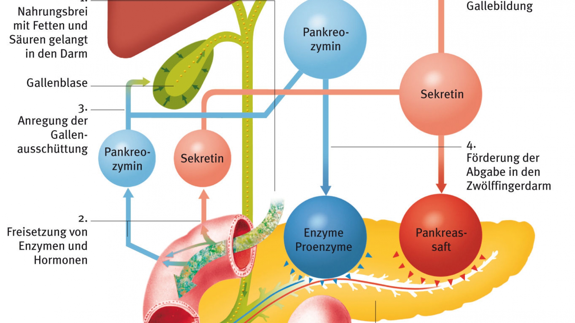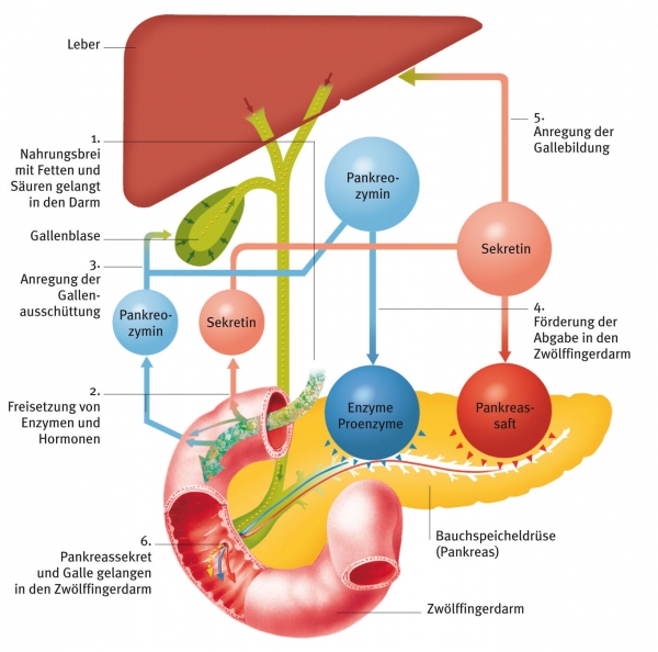 Absonderung von Pankreassaft in den Anfangsteil des Dünndarms, die einer hormonalen Regulation und der nervalen Steuerung durch das vegetative Nervensystem unterliegt. Ein fettreicher Speisebrei mit hohem Säuregehalt löst in der Dünndarmschleimhaut die Freisetzung von Hormonen aus, die nachfolgend eine Steigerung der Pankreassekretion bewirken.