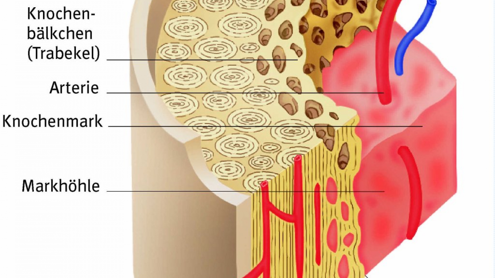 Das dichte Bindegewebe des Knochens besteht aus vier Schichten: Außen liegt die derbfaserige Knochenhaut (Periost). Nach innen schließt sich der Kompaktknochen (Kompakta) mit den zylinderförmigen, belastungsfähigen Osteonen und daran die schwammartige (spongiöse) Knochenschicht Spongiosa an. In einem Netzwerk aus Hohlräumen und Bälkchen befindet sich das Knochenmark.