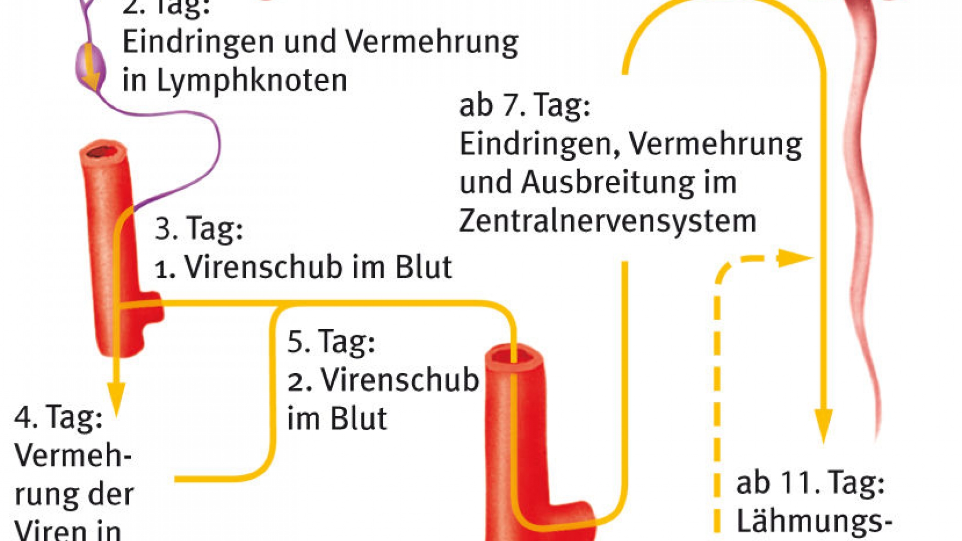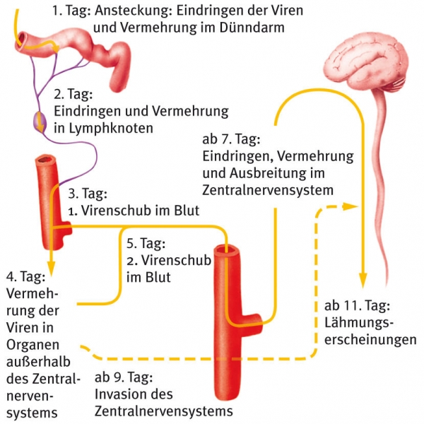 Kinderlähmung; Polioweltweit vorkommende Virusinfektion, die relativ häufig eine Infektion des Zentralnervensystems (Meningitis) und als Komplikation auch bleibende Lähmungen verursacht. Bei den ca. 0,1% der Infizierten, bei denen Lähmungen auftreten, beträgt die Letalität der Krankheit 40-60%. Eine Behandlung existiert nicht. Das Virus wird über verschmutzte Lebensmittel und direkten Kontakt übertragen, auch auf nicht immunisierte Erwachsene. Es gibt eine wirksame aktive Schutzimpfung, die dringend empfohlen wird.