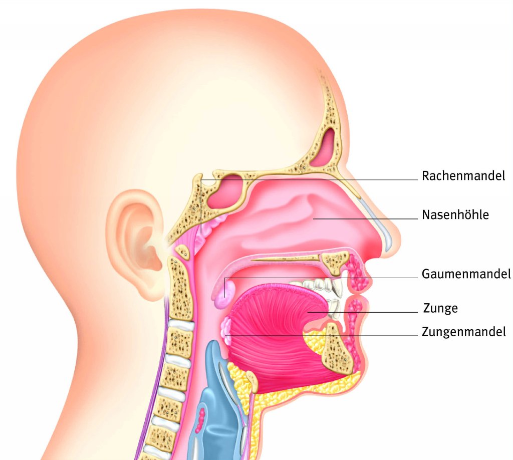 Die drei jeweils paarig angelegten Mandeln sind Ansammlungen lymphatischen Gewebes und schützen als so genannter lymphatischer Rachenring den Eingang zu Atemwegen und Verdauungstrakt. Die Gaumenmandeln sind am größten und liegen im hinteren Bereich der Mundhöhle. Die Zungenmandeln liegen am Zungengrund, die Rachenmandeln (gemeinhin auch als Polypen bezeichnet) im hinteren Rachenraum. Jedes Mandelpaar fängt eindringende Erreger ab und versucht, sie vor Ausbruch einer Infektion unschädlich zu machen.