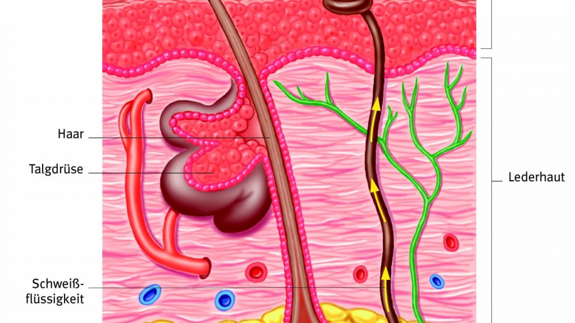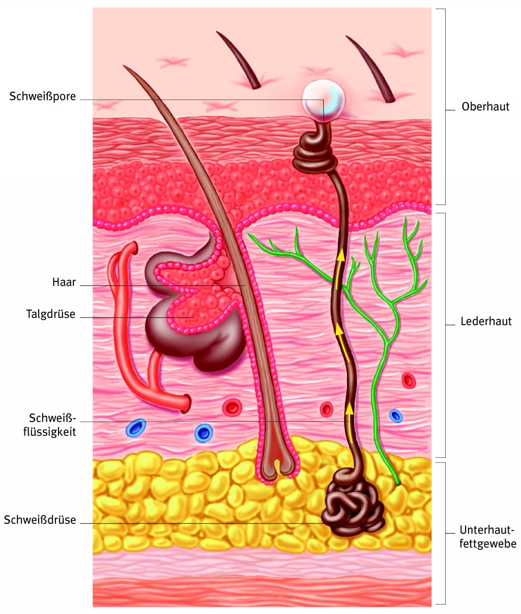 Die Haut enthält unzählige Schweißdrüsen. Schweißflüssigkeit wird als Reaktion auf verschiedene Faktoren gebildet, auch zur Ausscheidung von Abfallprodukten aus dem Körper. Schweiß hilft dem Körper auch bei der Abkühlung und zur Erhaltung einer konstanten Körpertemperatur.