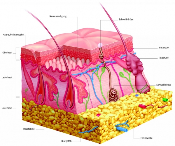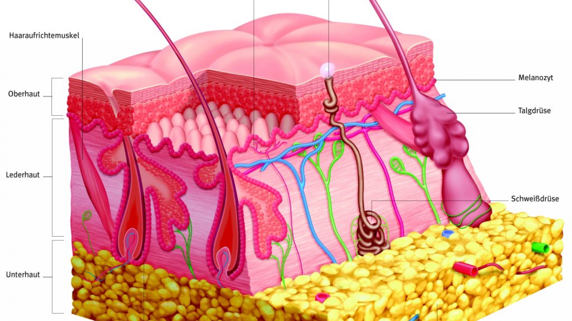 Ein Schnittbild zeigt den Aufbau der Haut. Sie besteht aus der äußeren Schicht, der Oberhaut (Epidermis), an die sich nach innen die Lederhaut (Corium) anschließt. In der Oberhaut liegen die Zellen (Melanozyten), die die Hautfarbe bestimmen. In der Lederhaut verläuft ein Netzwerk an Blutgefäßen, sensorischen Nervenendigungen, Schweißdrüsen, Haarfollikeln und Muskeln. Fasern sorgen für die Elastizität der Haut. Unterhalb der Lederhaut liegt das isolierende Unterhautfettgewebe.