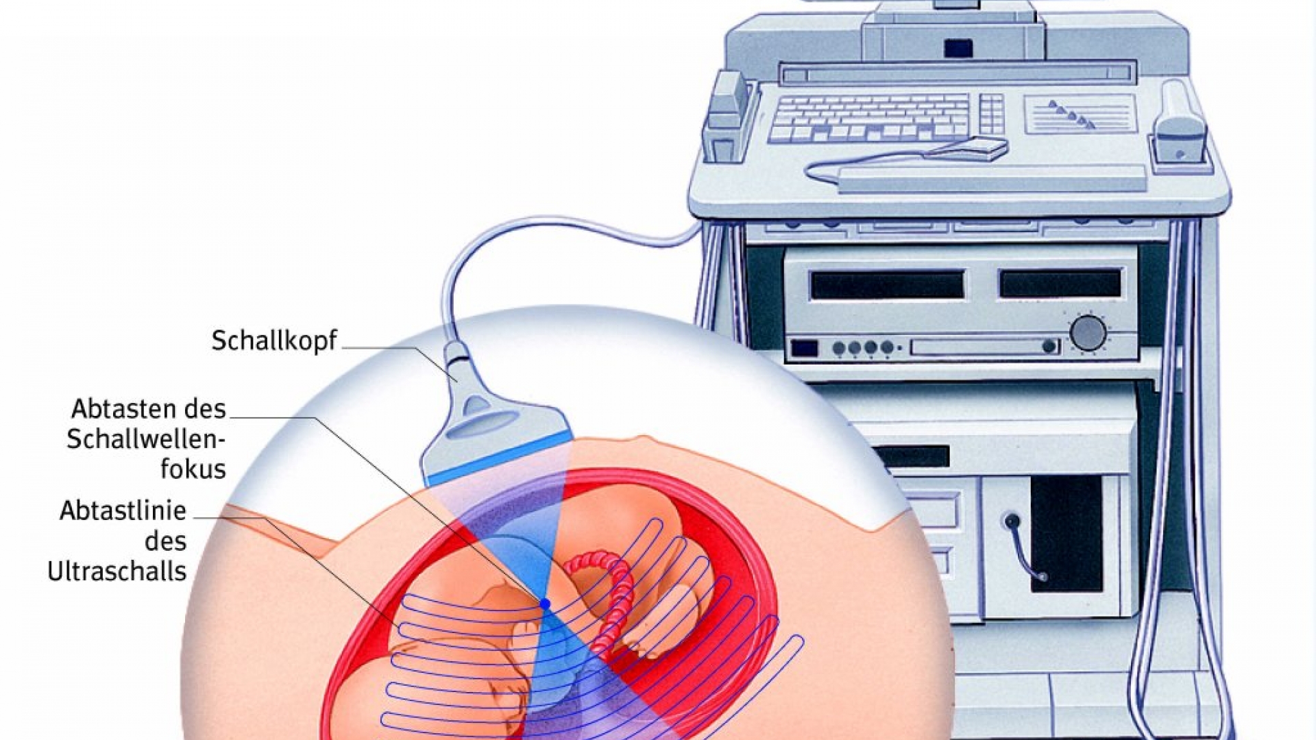 künstlich erzeugte Schallwellen oberhalb des hörbaren Spektrums (über 20 Kilohertz). Ultraschall wird an der Grenze zwischen Luft und Wasser reflektiert, kann aber sehr gut durch Fettgewebe und Muskeln tief in den Körper eindringen. Ultraschall wird zu diagnostischen und therapeutischen Zwecken eingesetzt. Auch Ultraschall-Diagnostik.