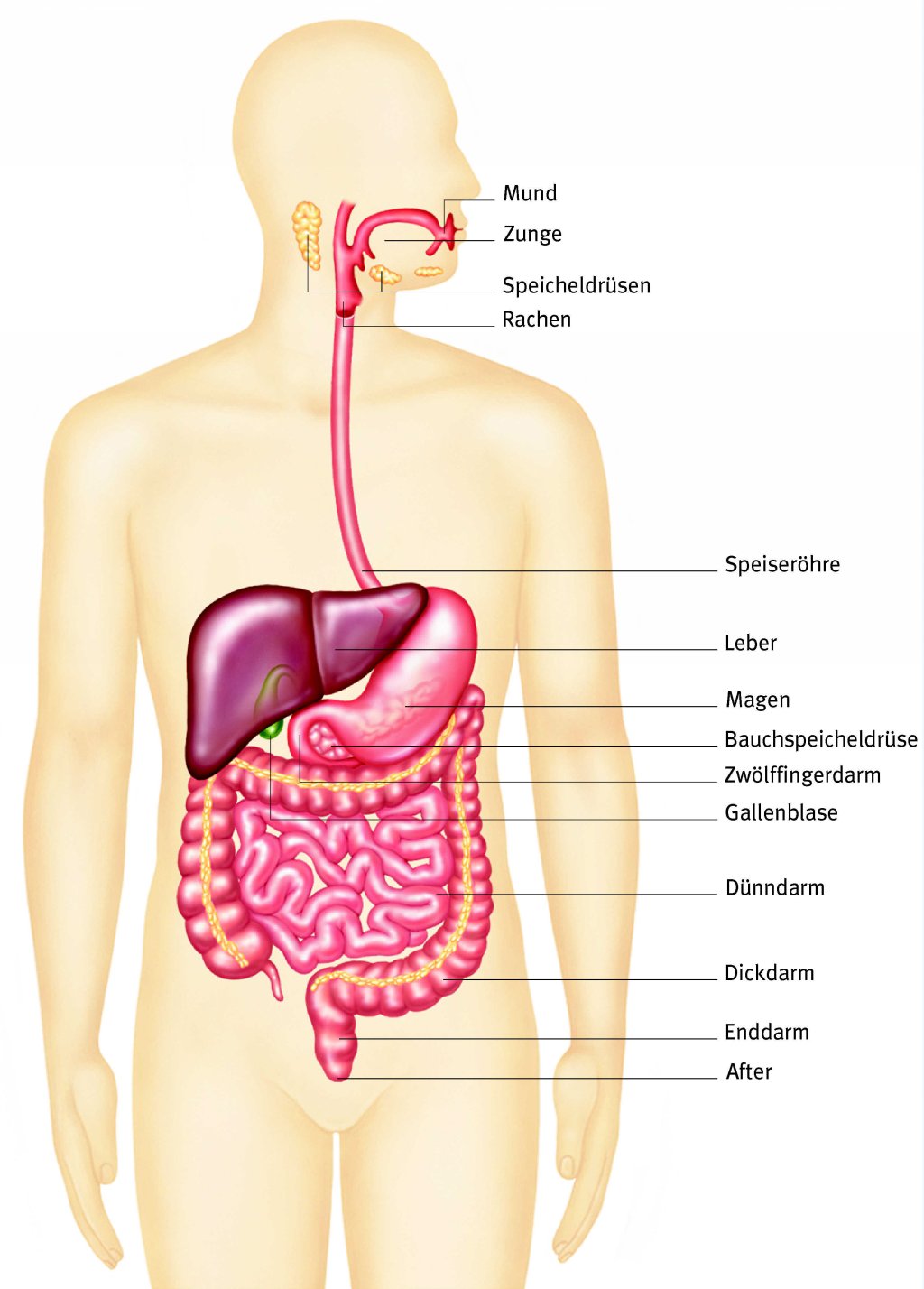 Der Verdauungskanal oder Magen-Darm-Trakt verläuft durch das Körperzentrum. Jeder Teil des Verdauungskanals hat seine spezielle Funktion. Im Mund erfolgt die Nahrungsaufnahme und -zerkleinerung, im Magen die Aufspaltung und Vermischung mit den Verdauungsäften und in Dünn- und Dickdarm die Resorption der Nährstoffe.
