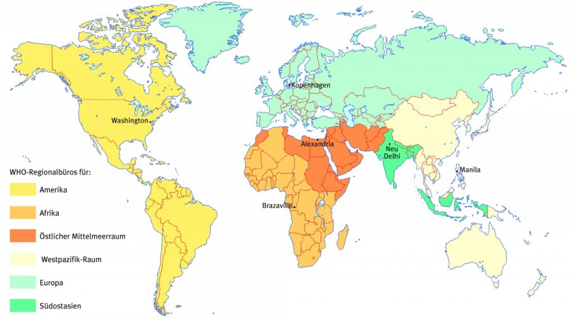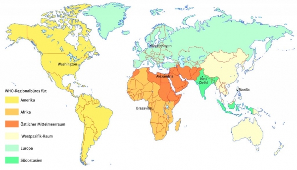 World Health OrganizationAbk. WHO, Gremium der Vereinten Nationen mit 193 Mitgliedsstaaten, Koordinationsbehörde für das internationale öffentliche Gesundheitswesen. Laut ihrer Verfassung hat die WHO den Auftrag, „allen Völkern zur Erreichung des bestmöglichen Gesundheitszustandes zu verhelfen“. Gesundheit wird von der WHO als Menschenrecht und wesentlicher Bestandteil der menschlichen Entwicklung definiert. Die Weltgesundheitsorganisation organisiert u. a. die weltweite Bekämpfung von Infektions- und Suchtkrankheiten, sorgt für eine Verbesserung der Versorgung mit Trinkwasser und Nahrungsmitteln und leistet Gesundheits- und Hygieneerziehung. Ihr Hauptsitz ist in Genf, weltweit ist die WHO mit sechs Regionalbüros vertreten.