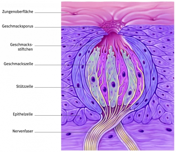 Geschmacksknospen sind Endigungen von Sinnesnerven und befinden sich auf der Zunge und in der Mundhöhle. Ein Mensch besitzt mehr als 10000 Geschmacksknospen, ihre Anzahl nimmt jedoch mit fortschreitendem Alter ab. Aus diesem Grund bevorzugen ältere Menschen oft stärker gewürzte Speisen.