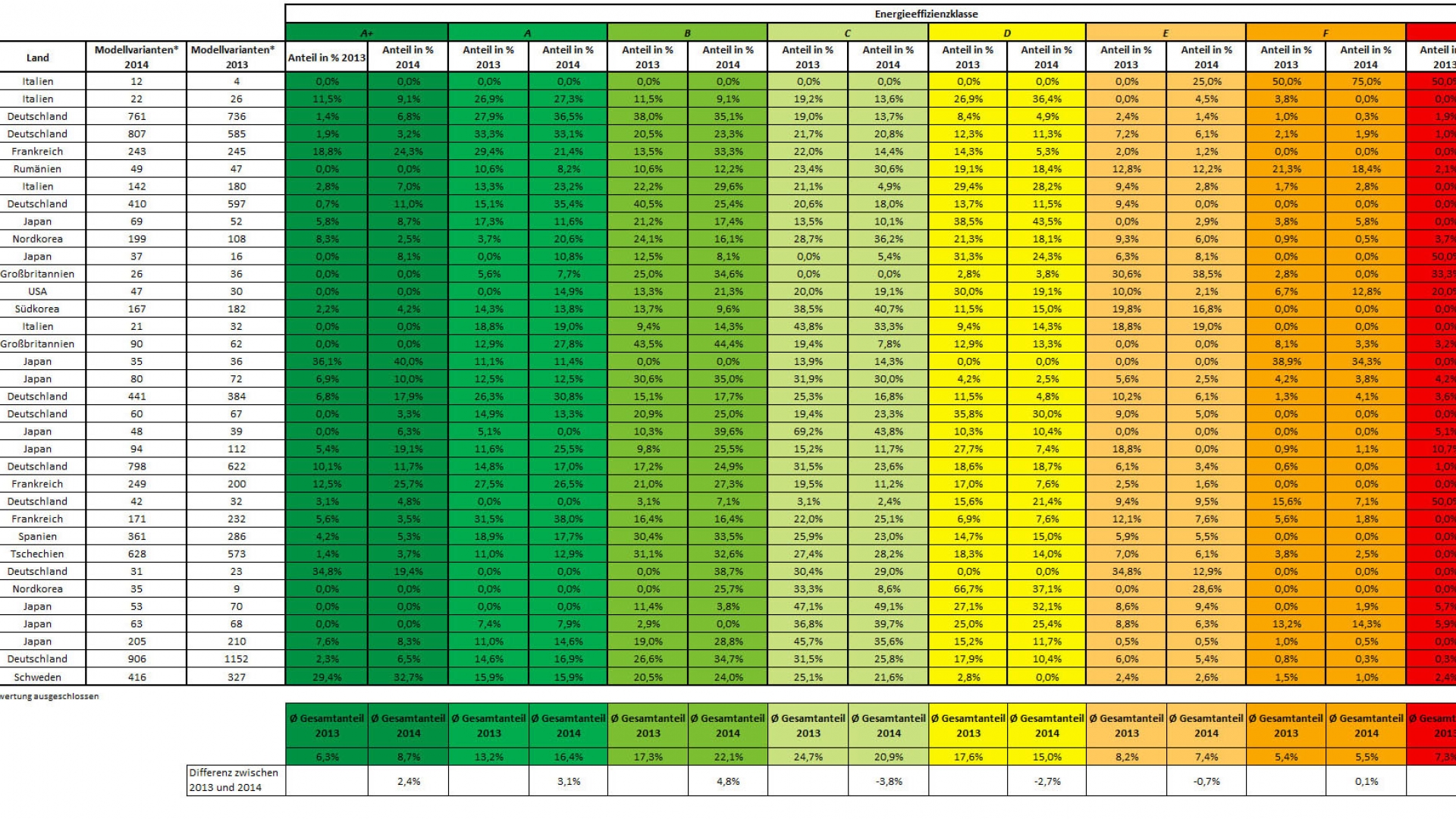 Die Statistik zeigt ein positives Bild. Im Vergleich zu 2013 ist der Anteil der sehr CO2-effizienten Neuwagen (Klassen A+, A, B) gestiegen. Bezogen auf das Gesamtportfolio der 35 Hersteller gibt es prozentual deutlich weniger Modelle in den mittleren (C, D) und wenig bis gar nicht effizienten (E, F, G) Klassen. Der wachsende Trend zum Umweltauto zeigt sich am deutlichsten in der Effizienzklasse B: 2013 erreichten 17,3 Prozent aller Modellvarianten diese Stufe, 2014 sind es bereits 22,1 Prozent. Die Bestbewertung A+ sichern sich immerhin 8,7 Prozent der begutachteten Neuwagenmodelle und damit 2,4 Prozent mehr als im Vorjahr. In der umweltschädlichsten Kategorie, mit G gekennzeichnet, ist ein Rückgang von 7,3 auf 4,1 Prozent zu verzeichnen.