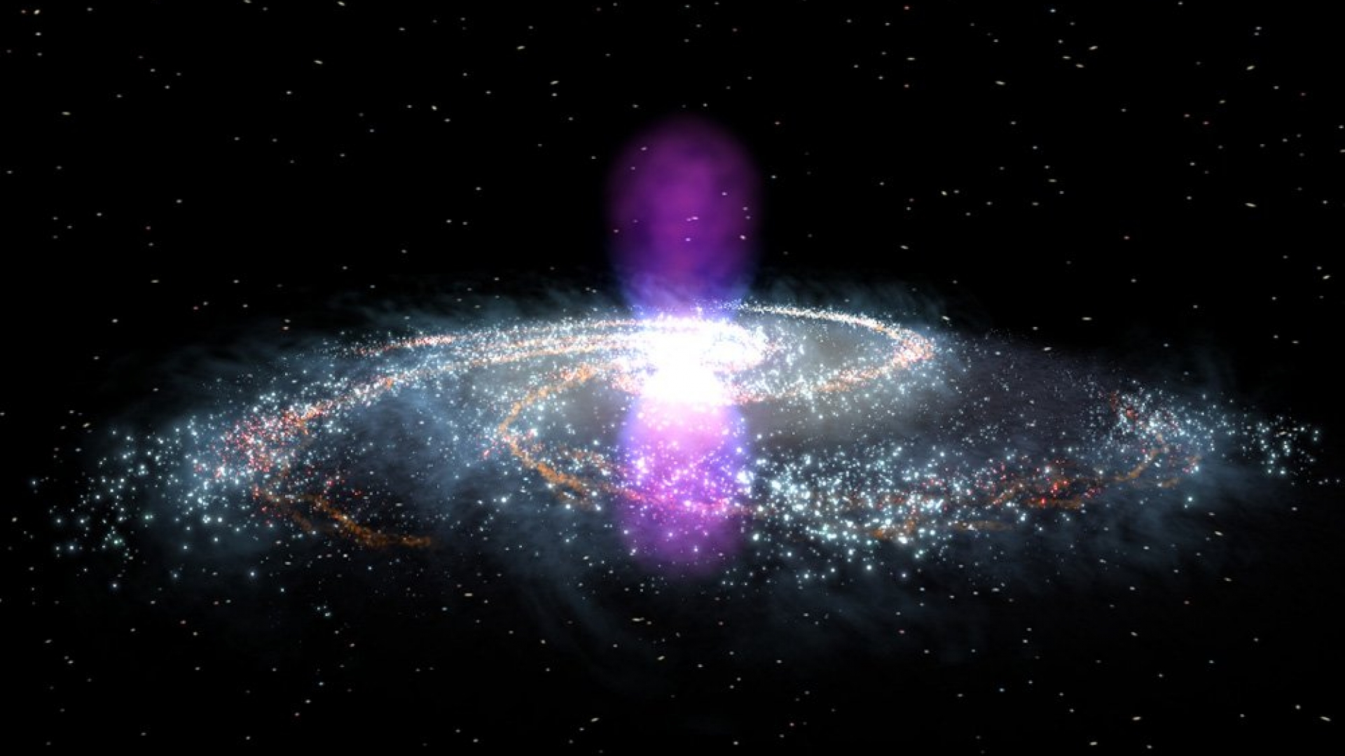 Noch mehr Überraschungen aber hat die Milchstraße parat, wenn man sie im Röntgenlicht, in Gammastrahlen oder im Radiowellenbereich anschaut. Vor allem in ihrem Zentrum treten dann einige erstaunliche Strukturen zutage. Die größten davon sind zwei gigantische Blasen aus schnellen Gasen und Gammastrahlung. Diese unsichtbaren Gebilde ragen jeweils mehr als 25.000 Lichtjahre nach oben und unten aus der Galaxienebene heraus.