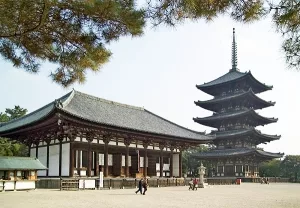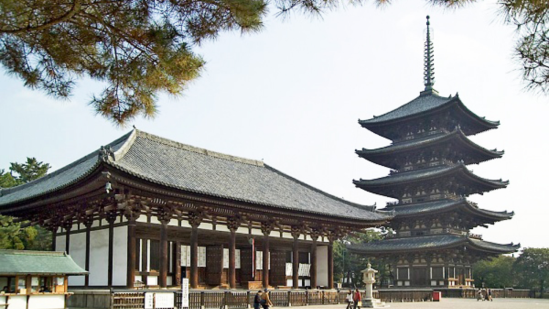 Der Kōfuku-ji am Eingang des Nara-Parks ist der größte Tempelkomplex der Innenstadt. Unter der Patronage der mächtigen Fujiwara-Familie soll die Anlage einst zehnmal größer als heute gewesen sein. Die 5-stöckige Pagode des Tempels ist mit über 50 m Höhe die zweithöchste Japans.