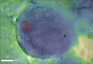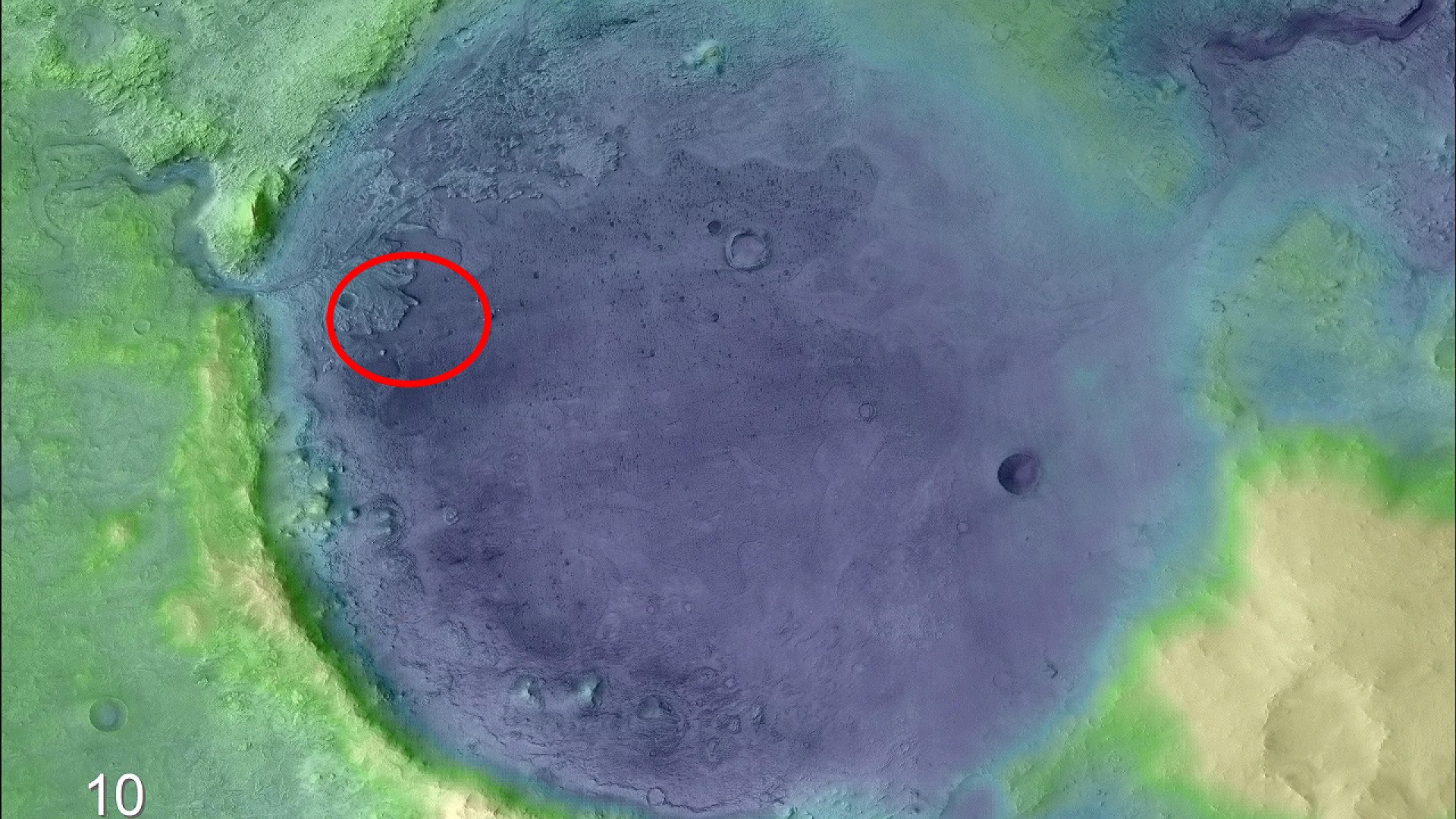 Der rund 45 Kilometer große Jezero-Krater liegt knapp nördlich des Marsäquators und war vor mehr als 3,5 Milliarden Jahren mit Wasser gefüllt. In der Senke lag ein tiefer See, in den durch zwei Flussdeltas frisches Wasser einströmte. Planetenforscher hoffen, dass sich in den Sedimenten des alten Seegrunds organische Moleküle erhalten haben, die vielleicht Beweise für einstiges Leben auf dem Mars liefern.