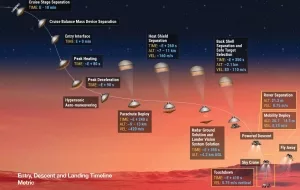 Rund elf Kilometer über der Oberfläche entfaltet sich nun der gut 20 Meter große Überschall-Fallschirm. Kurz darauf wird der Hitzeschild abgesprengt. Das gibt den Radarsensor und Kameras der Sonde den Blick auf die Oberfläche frei und erlaubt es dem Autopilotsystem, die Landestelle anzusteuern. Etwa 2,1 Kilometer über dem Boden bei immer noch rund 300 Kilometern pro Stunde wird die Hülle mit dem Fallschirm abgesprengt und die Landetriebwerke zünden. Sie bremsen die Landeeinheit noch weiter ab, bis sie rund 20 Meter über der Oberfläche schwebt.