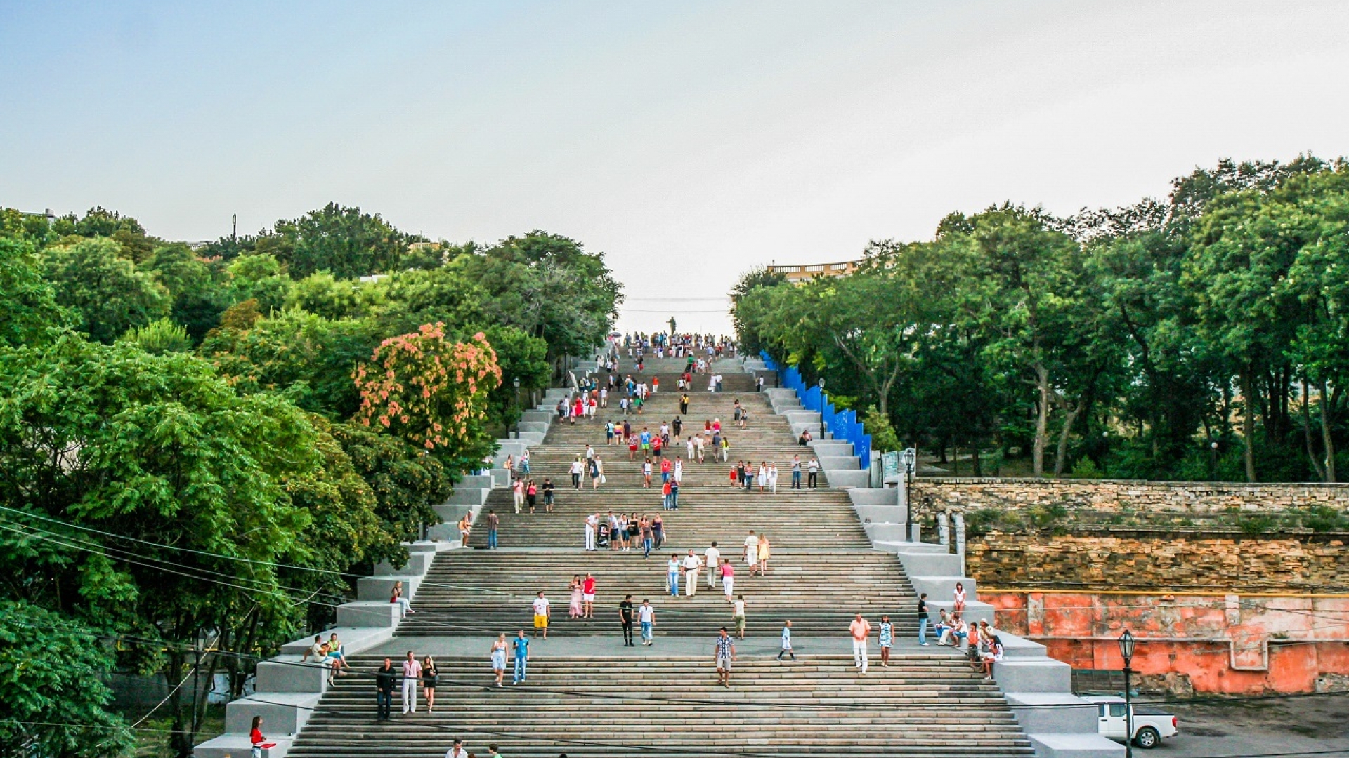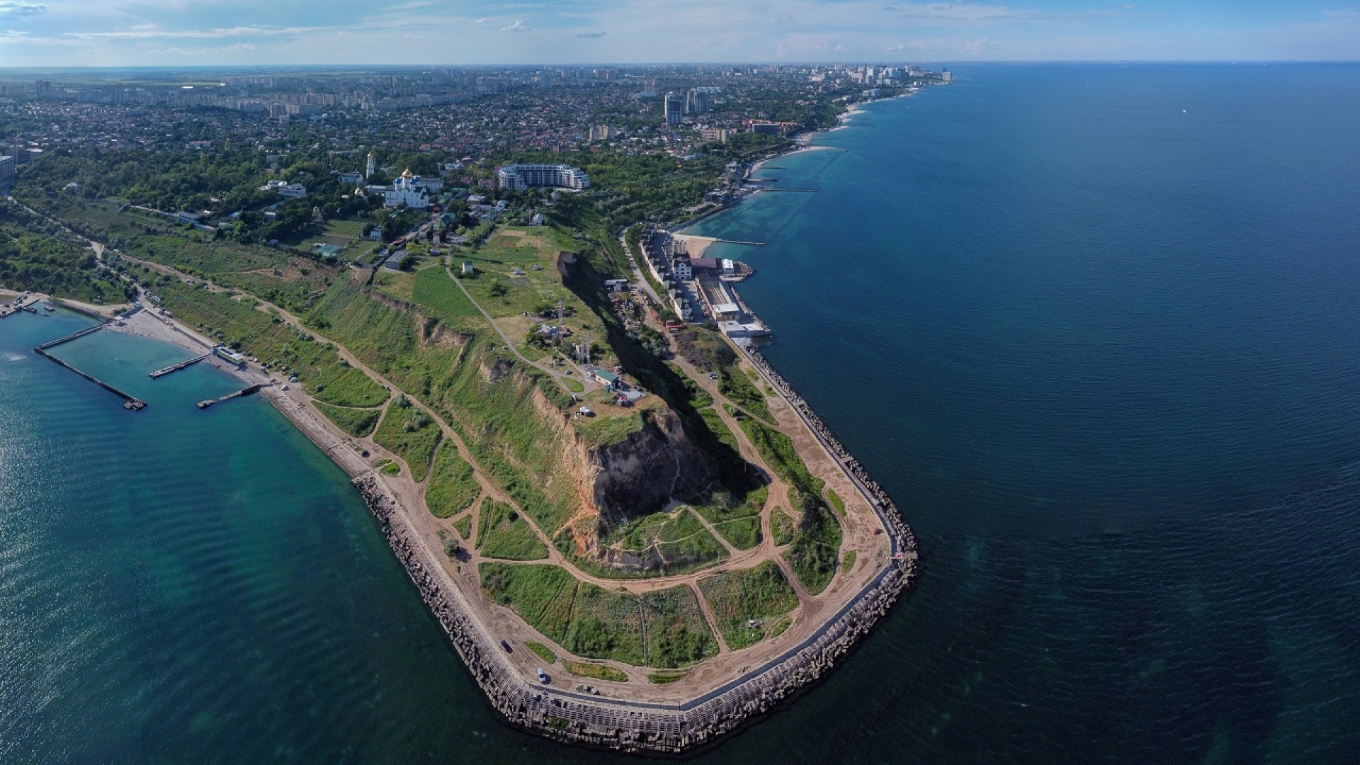 Die Stadt liegt auf einem Plateau etwa 40 Meter über dem schwarzen Meer, an das die Stadt grenzt. Die Odessiten gelangen zum Hafen über die große Potemkinsche Treppe. Die Bauweise der Treppe erzeugt absichtlich eine perspektivische Verzerrung, die sie wesentlich länger erscheinen lässt - fast so als würde sie direkt in den Himmel führen. Durch Szenen aus dem Film "Panzerkreuzer Potemkin" von 1925 wurde die Anlage auch international bekannt und ist heute eines der Wahrzeichen der Stadt.