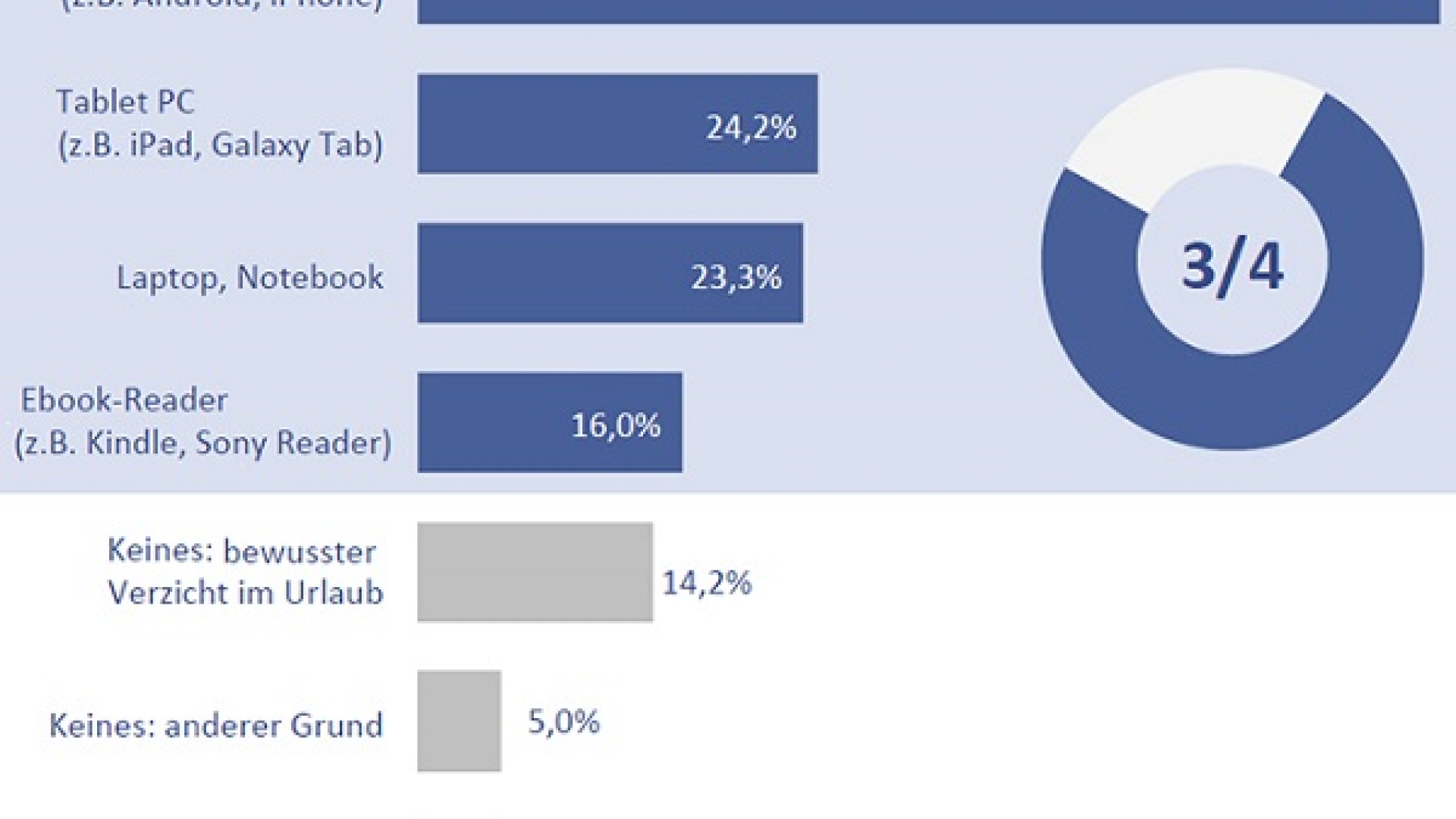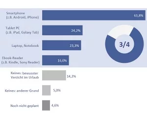 Die meisten deutschen Urlauber haben daher ihre Internet-Nutzung im Urlaub schon fest eingeplant, wie eine Umfrage unter mehr als 2.000 deutschen Internet-Nutzern vor kurzem ergab. Demnach nehmen über 60 Prozent der Urlauber ein Smartphone mit auf ihre Reise, 40 Prozent haben sogar zwei Geräte dabei, größtenteils Smartphone und Tablet.