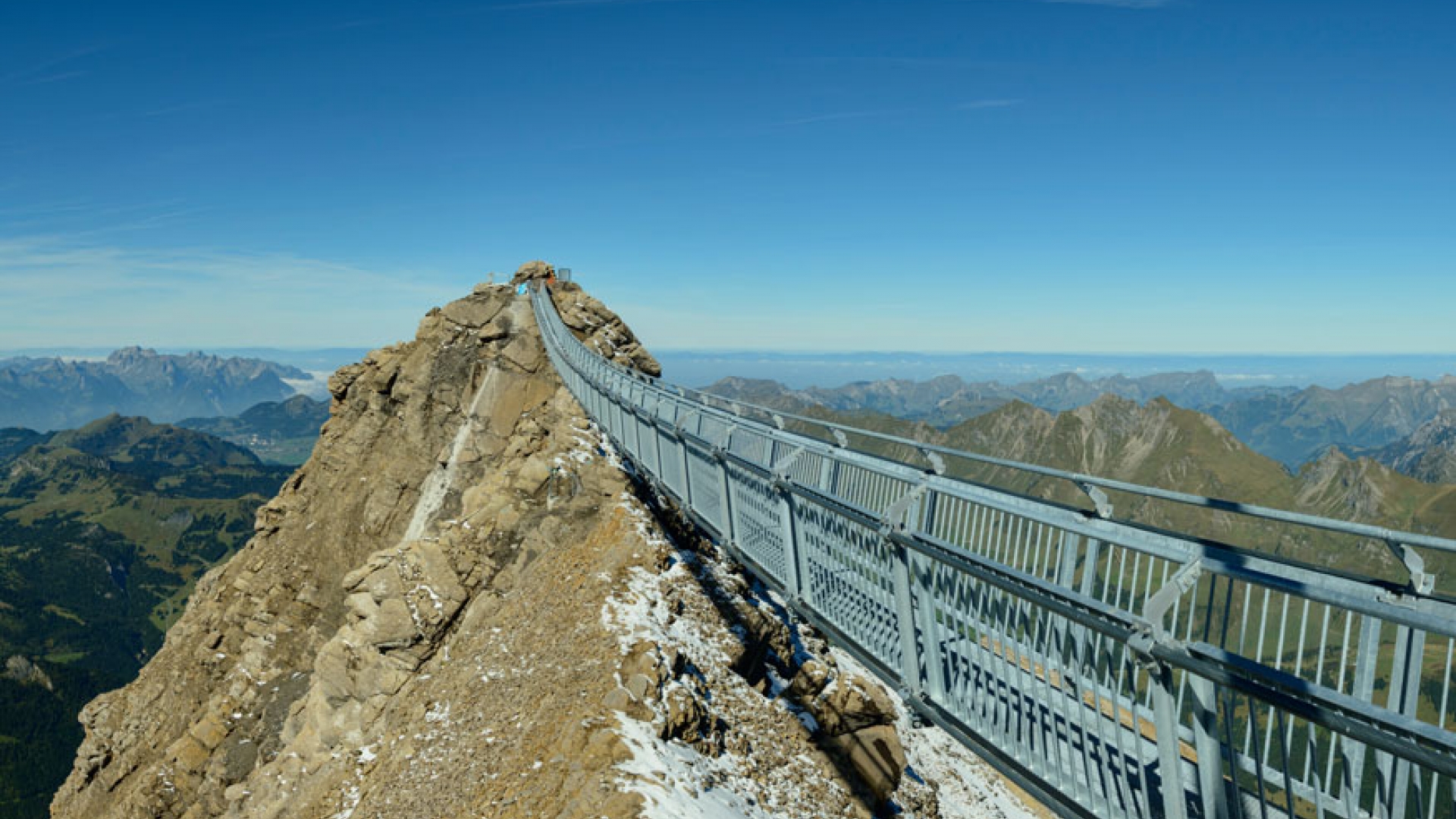 Die "Peak Walk" getaufte Hängebrücke ist 107 Meter lang und rund 80 Zentimeter breite – für einen Fußgänger also gerade ausreichend Platz. Der luftige Weg in 3.000 Metern Höhe verbindet die beiden Gipfel des Scex Rouge miteinander. Vom Startpunkt View Point aus geht es mit rund 15 Prozent Steigung aufwärts zum höchsten Punkt des Berges.