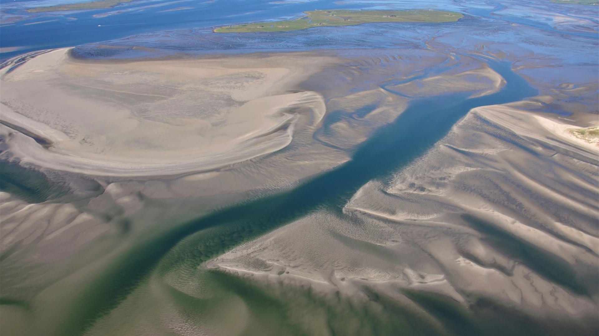 Kurs West-Nordwest. Weite Teile des Wattenmeeres sind nun trockengefallen und es ist wohl die schönste Zeit, diese Naturlandschaft von oben zu betrachten. Ein Ausflugsschiff zieht von Büsum über den Norderpiep, den großen Gezeitenstrom, nach West. Im Gegenlicht glitzert das Watt wie Silber, das Licht der Morgensonne lässt die großen Sände "Blauort" und "Isern Hinnerk" golden leuchten. Die Maschine ist auf 2.000 Fuß - circa 700 Meter - geklettert und behält diese Höhe nun bei. Unten ist eine Bake zu erkennen, ein riesiges Seezeichen im Nirgendwo, das klein und verloren wirkt wie ein Streichholz, das im Sand steckt. Die Sände sind geformt wie Halbmonde und man erkennt daran, dass die Strömung diese Strukturen modelliert.