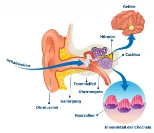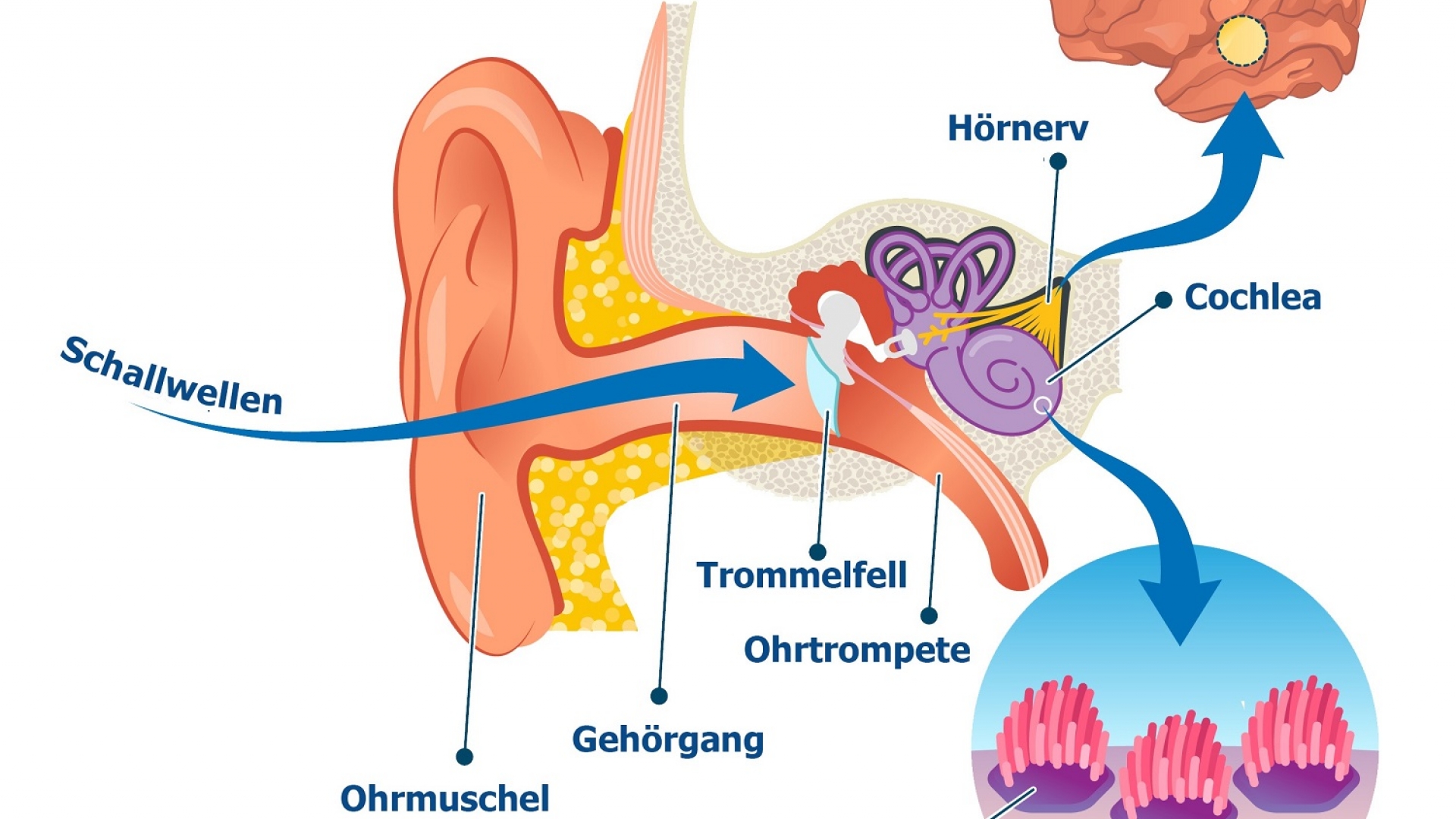 Die von der Geräuschquelle ausgehenden Schallwellen werden vom Außenohr in den Gehörgang geleitet und erzeugen dort eine Schwingung des Trommelfells. Diese überträgt sich über die Gehörknöchelnchen ins Innenohr und dort auf die Flüssigkeit in der Gehörschnecke – in der Fachsprache Cochlea genannt. Die von den Schwingungen verursachten Bewegung der Flüssigkeit wiederum beugen die feinen Haarzellen an der Wand der Cochlea, welche diese Bewegung in elektrische Signale umwandeln. Der Hörnerv leitet diese weiter ans Gehirn, wo sie als Geräusch interpretiert werden.