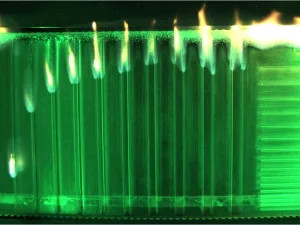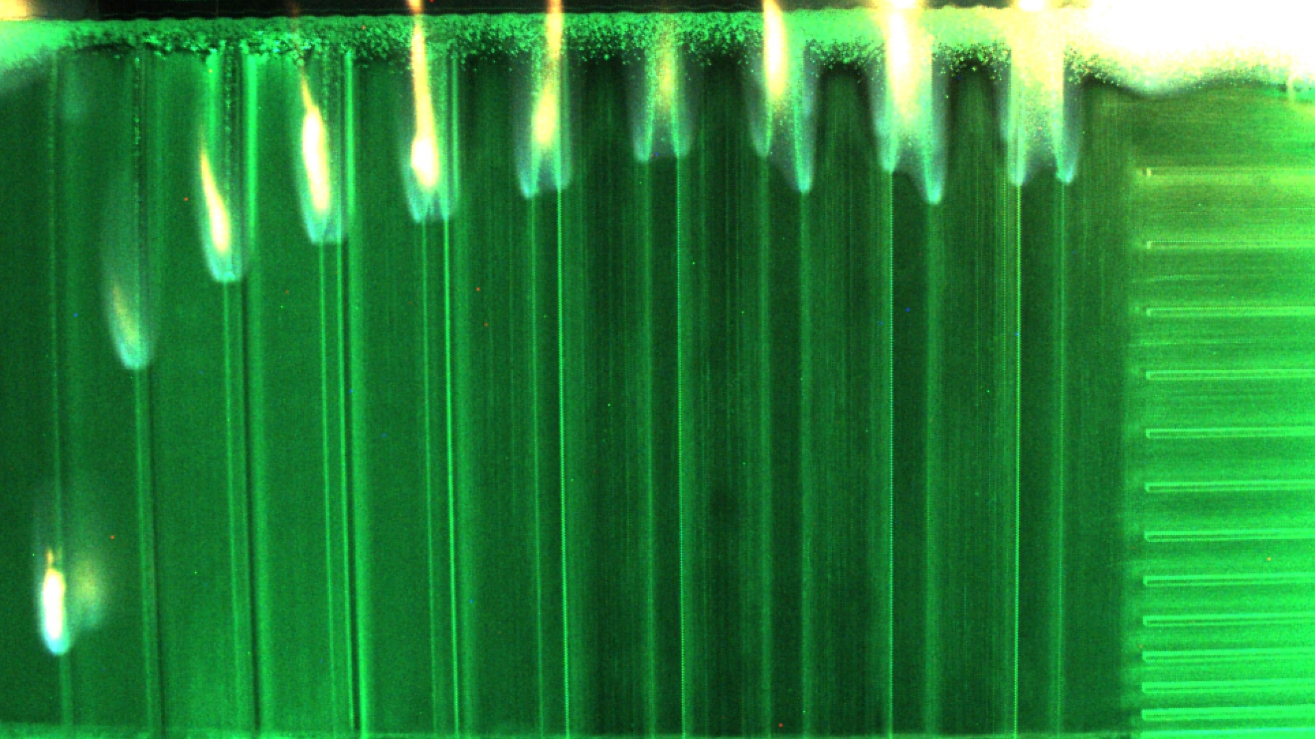 Doch es gibt noch eine Besonderheit bei einem Feuer im All, wie vor Kurzem ein Experiment im leeren Cygnus-Versorgungsmodul der ISS gezeigt hat. Dafür wurde ein geripptes Plexiglasstück an einer Seite mit einem stetigen Luftstrom angeblasen. Dann wurde am anderen Ende eine Flamme entzündet. Es passierte Überraschendes: Statt auszugehen oder sich mit dem Luftstrom auszubreiten, wanderten die Flammen dem Luftstrom entgegen. Bei normaler Schwerkraft wäre dies unmöglich.