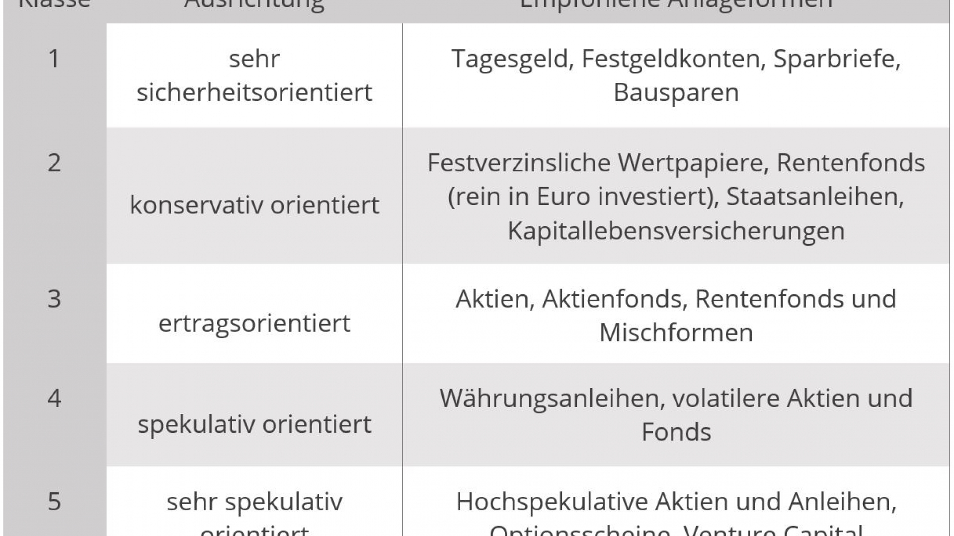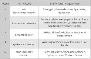 Daher werden Investoren grundsätzlich in mehrere Risikoklassen unterschieden. Je nachdem, welche Art und Menge von Risiken gewünscht sind oder zielgerichtet toleriert werden, bieten sich andere Produkte an. Grundsätzlich werden fünf Risikoklassen unterschieden, einzelne Publikationen fügen zur genaueren Staffelung noch mehr hinzu, so dass es auch sechs, sieben oder gar zwölf Klassen sein können.