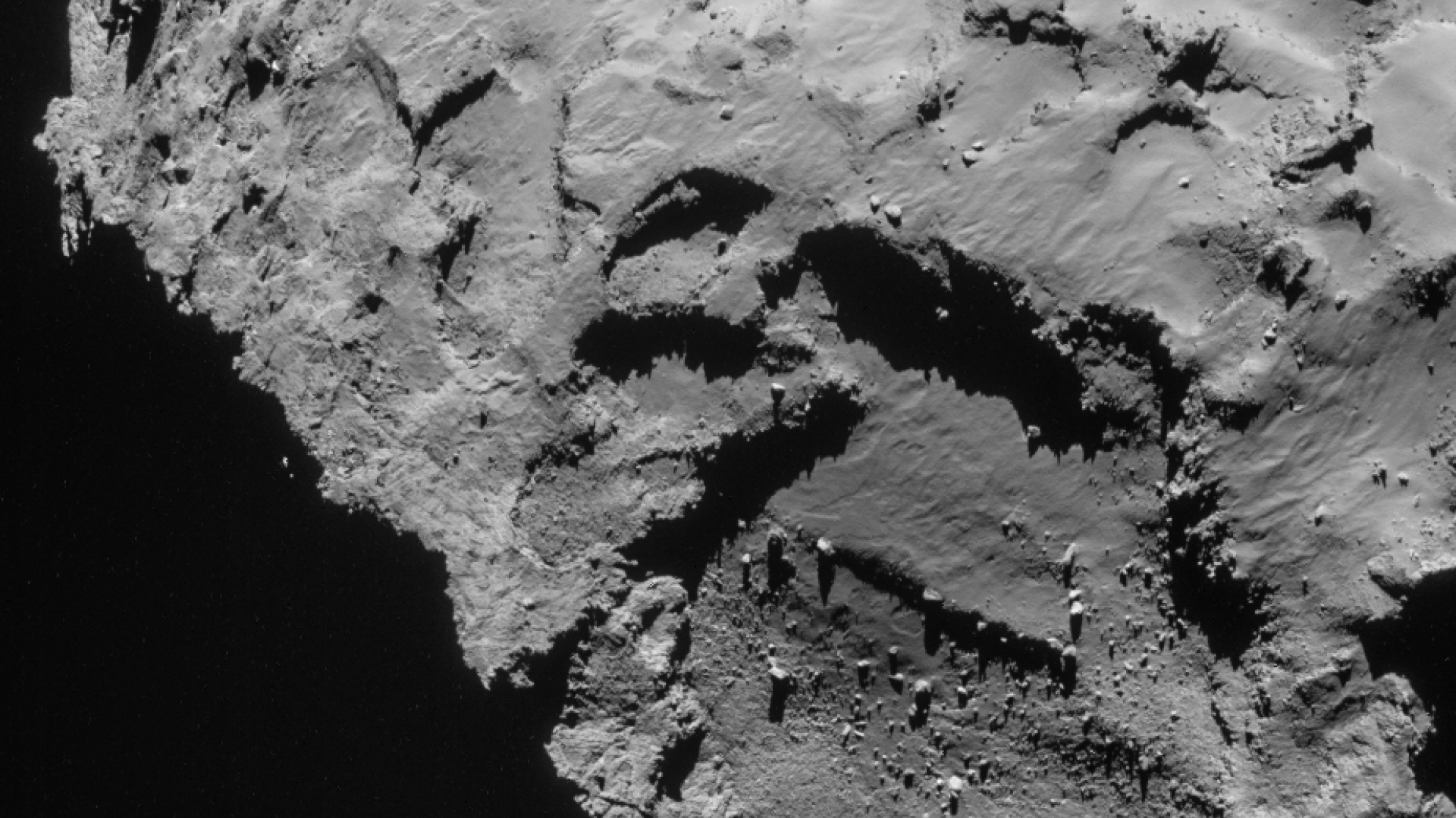 Auch der Untergrund selbst ist möglicherweise schwierig zu bewältigen: Rosettas Bilder haben bereits gezeigt, wie übersät mit Felsbrocken und Spalten Churyumov-Gerasimenko ist. Das zerklüftete Äußere und die eigenartige Gummienten-Form des Kometen machten die Suche nach einem geeigneten Landeplatz für Philae komplizierter: Auf zu vielen Felsen und Rissen könnte der Lander umstürzen. Er braucht außerdem ausreichend Sonne für seine Solarzellen, darf aber auch nicht überhitzen. Und schließlich muss regelmäßiger Funkkontakt mit Rosetta möglich sein.