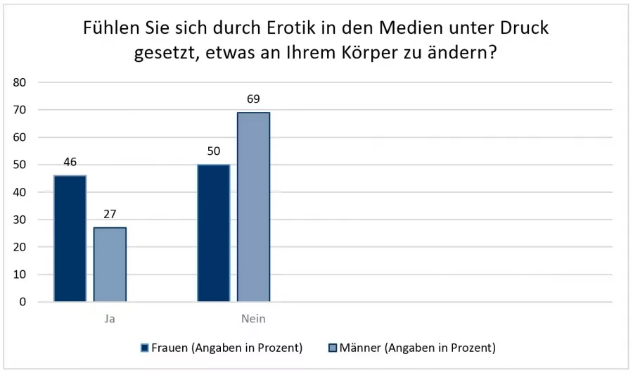 Die Medien bestimmen, was schön ist und was nicht. Oft ist es Frauen wie Männern gleichermaßen nicht möglich, diesen medialen Vorbildern zu entsprechen, denn sie konstruieren die Illusion des perfekten Menschen. Es wird verändert, retuschiert und beschönigt, bis aus einem sowieso schon schönen Model eine unerreichbare Wunschvorstellung wird, die dazu führt, dass „normale“ Menschen sich in ihren Körpern unwohl fühlen. Frauen sind davon in besonderem Maße betroffen, wie die nachstehende Statistik zeigt.
