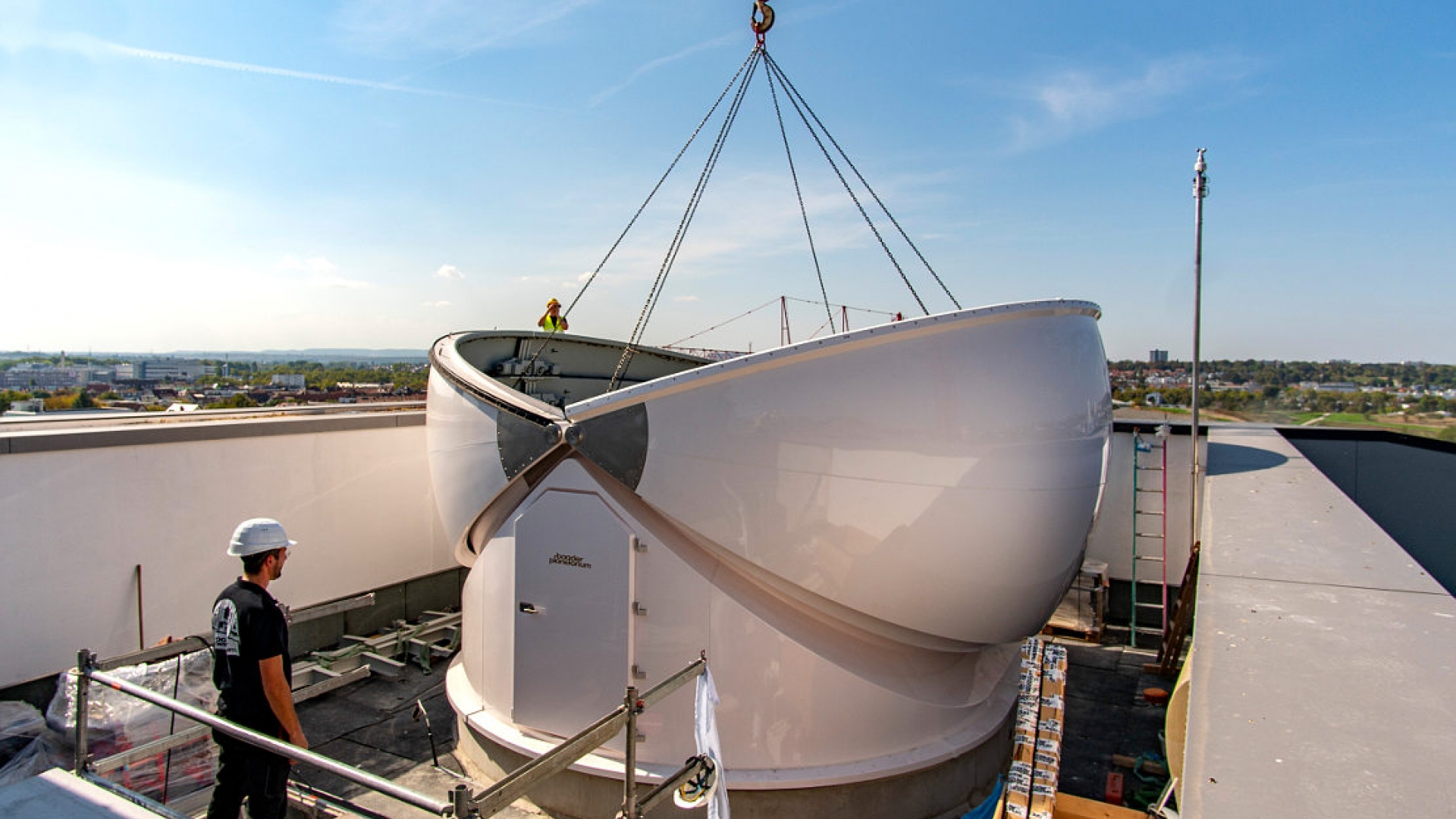 Das zentrale Element der Sternwarte bildet eine 6,5 Meter breite Teleskop-Kuppel, die seit kurzem das neue Hauptgebäude der experimenta krönt: Ein Kran hat das fünf Tonnen schwere Gebilde dem schimmernden Bau im Herzen Heilbronns aufs „Haupt“ gesetzt. Es handelt sich um eine besondere Form einer Teleskop-Kuppel: Sie kann den Blick auf den gesamten Himmel freigeben. „In einer normalen Teleskop-Kuppel gibt es nur einen vergleichsweise kleinen Schlitz, durch den das Fernrohr blickt, damit nicht der ganze Innenraum der Außenwelt ausgesetzt ist“, erklärt Bromann. „Unsere AllSky-Kuppel kann sich hingegen wie eine Muschel öffnen und den Besuchern den Blick auf den gesamten Sternenhimmel freigeben“.
