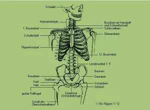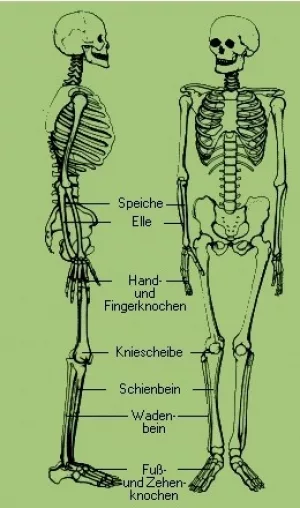 Das Knochengerüst des Menschen setzt sich zusammen aus Schädel- und Kopfknochen, Wirbeln und Brustkorbknochen, dazu den Gliedmaßengürteln und den Gliedmaßen. Im Einzelnen enthalten das Kopfgerüst: 15 Schädel- und 18 Gesichtsknochen; die Wirbelsäule: 7 Hals-, 12 Brust- und 5 Lendenwirbel; der Brustkorb: 1 Brustbein, auf beiden Seiten je 12 Rippen; der Schultergürtel: 2 Schlüsselbeine und 2 Schulterblätter; die Arme: je 1 Oberarmknochen, Elle, Speiche, 8 Handwurzelknochen, 5 Mittelhandknochen, 5 Grund-, 4 Mittel- und 5 Endglieder der Finger auf jeder Seite (der Daumen hat kein Mittelglied); der Beckengürtel: 2 Hüftknochen, Kreuzbein mit Steißbein; die Beine: je 1 Oberschenkelknochen, Kniescheibe, Schien- und Wadenbein, 7 Fußwurzelknochen, 5 Mittelfußknochen, 5 Grund-, 4 Mittel- und 5 Endglieder der Zehen (die große Zehe hat kein Mittelglied).