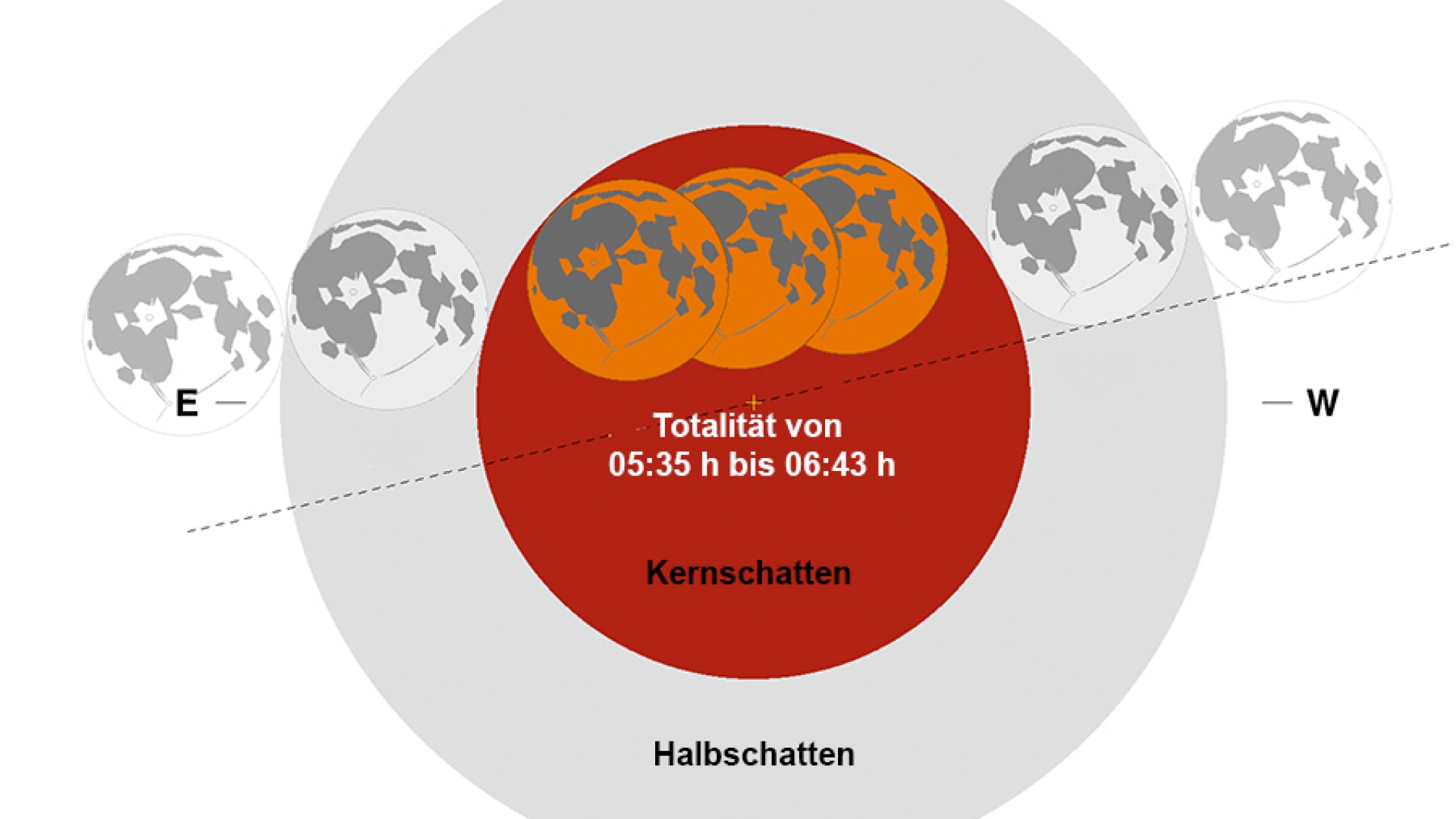 Die Mondfinsternis beginnt am frühen Morgen gegen 03:30 Uhr, wenn der Mond in den Halbschatten der Erde eintritt – er wird leicht dunkler. Klarer zu erkennen ist aber die zweite Phase der Mondfinsternis, die um 04:30 Uhr beginnt. Dann tritt der am westlichen Himmel stehende Mond in den Kernschatten der Erde ein und wir können sehen, wie nach und nach immer größere Teile des Vollmonds im Dunkel versinken.