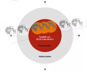 Gegen 05:40 Uhr beginnt dann der Höhepunkt der Finsternis: die rund eine Stunde dauernde Totalität. In dieser Phase leuchtet der immer tiefer über dem Horizont stehende Erdtrabant rötlich. Die Mondfinsternis endet gegen 08:50 Uhr, zu einer Zeit, in der die Sonne bereits aufgegangen ist und der Mond knapp unter dem Horizont steht.