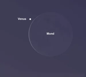 Am 6. April wird der sichelförmige Mond die Venus verdecken – leider nach Sonnenaufgang.