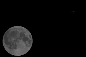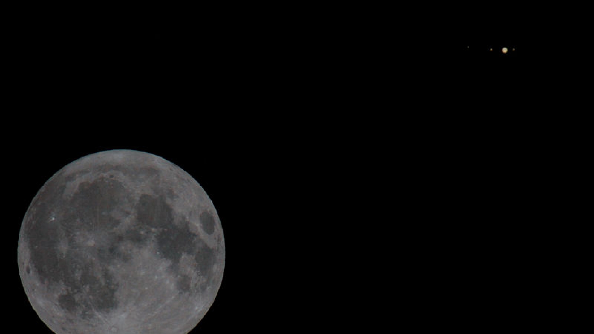 Am 10. April rückt der Jupiter dem Vollmond auf die Pelle. Allerdings steht der Mond bei uns im Gegensatz zu dieser Aufnahme von 2008 unterhalb des Planeten.