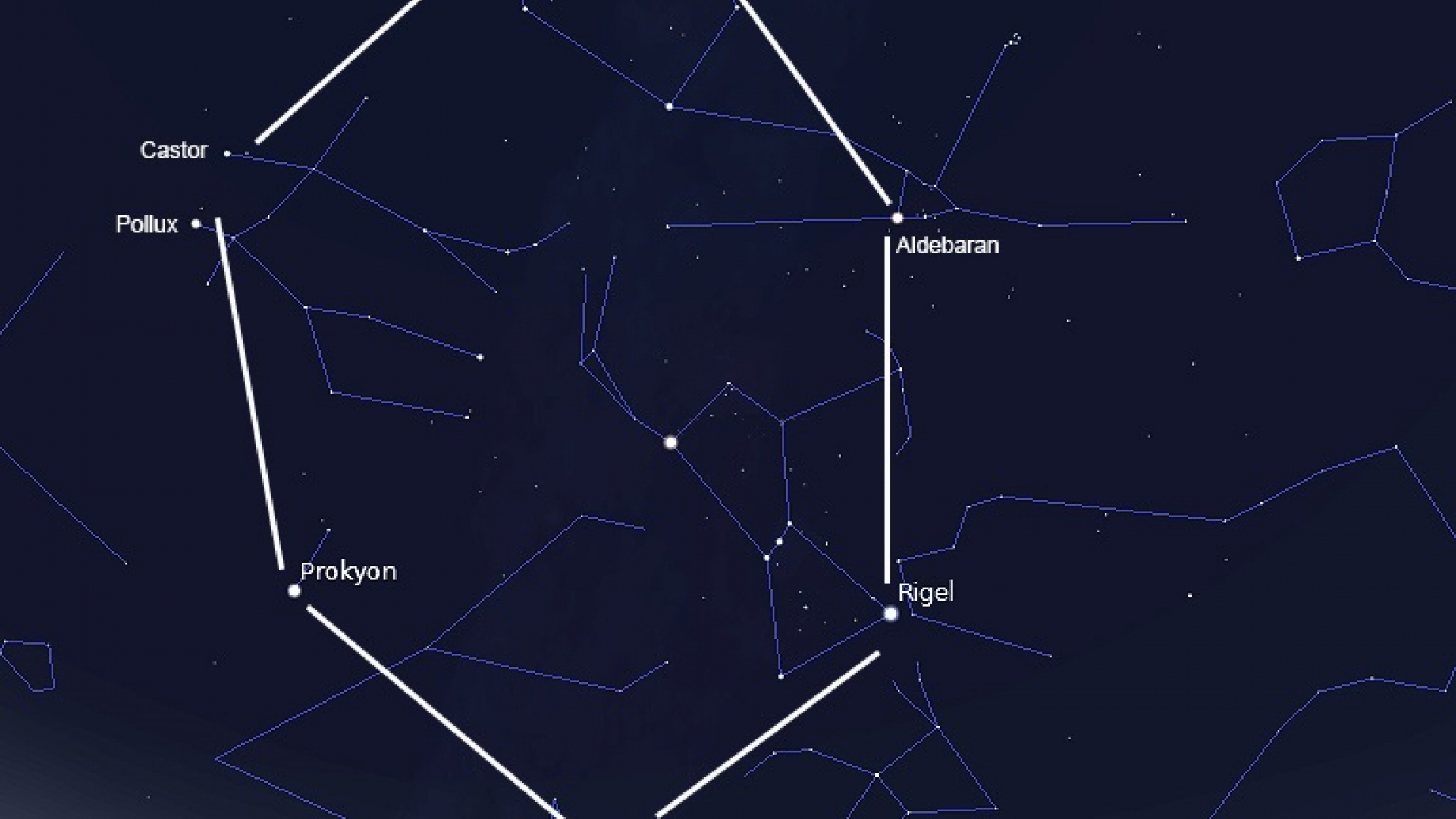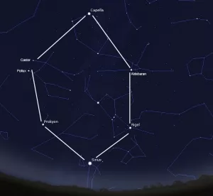 Die sechs hellsten Sterne der Wintersternbilder bilden zusammen das Wintersechseck - kein echtes Sternbild, aber eine leicht erkennbare Sechseck-Form am Himmel, die sogar von relativ hellen Standorten noch gut erkennbar ist. Der Sirius bildet dabei die untere linke Ecke des Sechsecks, rechts neben ihm steht Rigel, der "Fußstern" des Orion. Schräg darüber folgt der Rote Riese Aldebaran im Stier und noch darüber die Capella im Fuhrmann. Wieder nach unten geht es zu Castor und Pollux in den Zwillingen und schließlich zum Procyon im Kleinen Hund.
