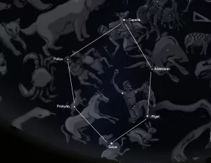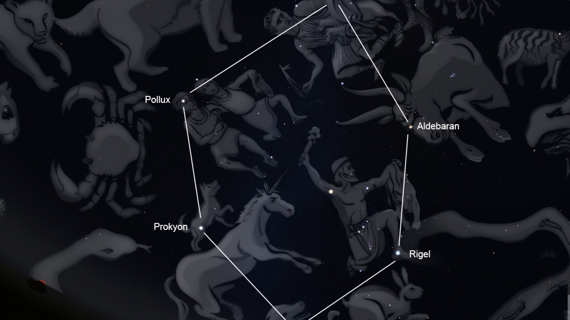 Ebenfalls prominent am Himmel steht zurzeit das Wintersechseck. Dieses ist kein Sternbild, sondern eine Form, die aus den hellsten Sternen von sechs verschiedenen Sternbildern besteht. Die Ecken dieses großen Sechsecks bilden die Capella im Sternbild Fuhrmann, der rötliche Aldebaran im Stier, der Rigel als Fußstern des Orion, der Sirius im Großen Hund, der Prokyon im Kleinen Hund und schließlich die beiden Zwillingsterne Kastor und Pollux.