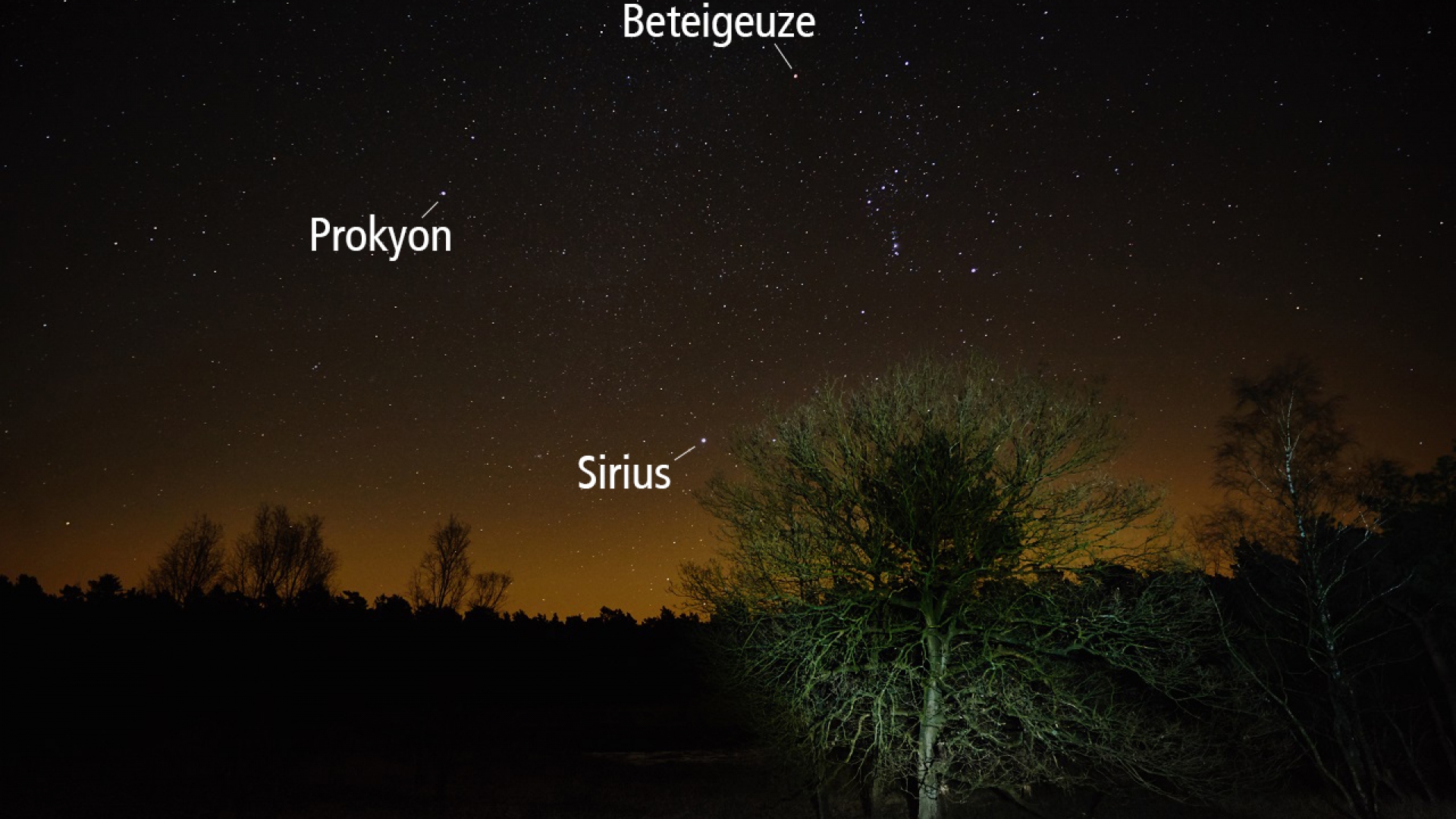 Selbst von hellen Standorten gut zu sehen ist in diesen Wochen auch das Wintersechseck – kein Sternbild, sondern eine auffällige geometrische Anordnung der hellsten Sterne von sechs Wintersternbildern. Zu ihnen gehört als oberer Ecke die Capella im Fuhrmann, schräg darunter stehen die hellen Kopfsterne der Zwillinge als zweite Ecke. Unter diesen folgt der Stern Procyon im Kleien Hund und der helle Sirius im Großen Hund. Die beiden restlichen Ecken bilden der Stern Rigel als rechter Fußstern des Orion und der rötliche Aldebaran, das Auge des Stiers.