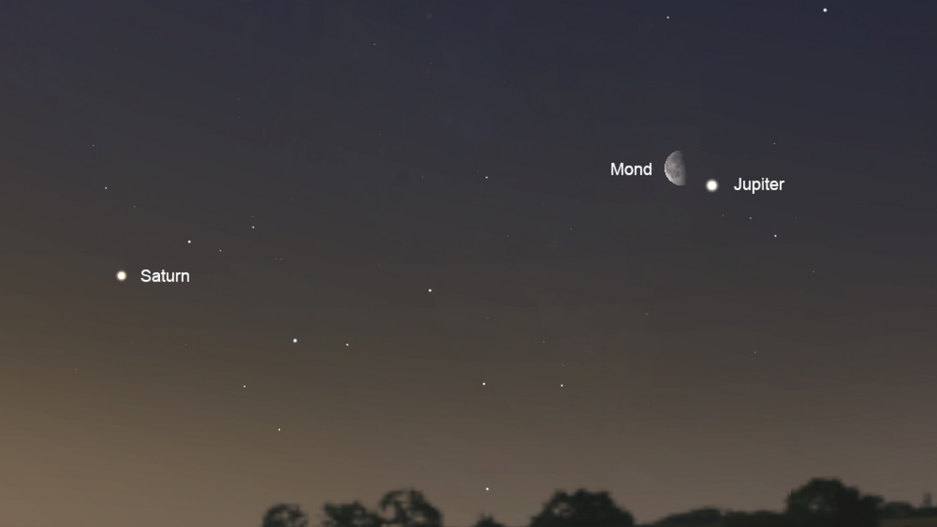 Etwa zwei Stunden nach dem Jupiter geht gegen 05:00 Uhr morgens der Saturn im Südosten auf. Der Ringplanet leuchtet allerdings deutlich weniger hell und steht näher am Horizont als sein größerer Nachbar. Den dritten im Bunde bildet die Venus: Sie strahlt in diesen Wochen weiterhin als hellster "Morgenstern" und bleibt bis in die Morgendämmerung hinein als hellster Lichtpunkt am Himmel gut sichtbar.