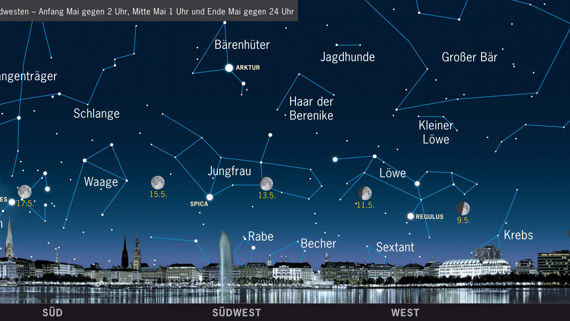 Richtig dunkel ist es dadurch Anfang Mai nur rund fünf Stunden, Ende Mai sogar nur etwa zweieinhalb Stunden. Weil die Sonne zudem nicht mehr sehr weit unter den Horizont sinkt, beginnen jetzt in Nordeuropa die weißen Nächte: Die Zeit, in der es die gesamte Nacht hindurch nicht mehr stockdunkel wird. Wer in Norddeutschland lebt, kann ab Ende Mai diese noch von leichtem Restlicht erhellten Nächte genießen. Für die Beobachtung von Sternen oder Sternschnuppen ist das zwar wenig günstig, aber bevor es so weit ist, hat der Himmel noch einiges zu bieten.