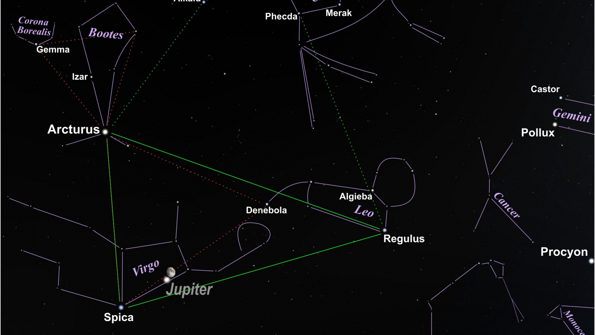 Am 5. Mai leitet der Mond Sternengucker erneut zu einem sehenswerten Anblick. Dann steht der Erdtrabant beim Stern Regulus im Leitsternbild des Frühlings – dem Löwen. Neben dem Stern Regulus gehören auch die ebenfalls auffälligen Sterne Denebola und Algieba zum Sternbild Löwe. Übersetzt man ihre Namen aus dem Arabischen, bedeuten sie so viel wie „Schwanz“ und „Mähne des Löwen“. Zusammen mit dem Stern Arcturus im Bärenhüter und Spica in der Jungfrau bildet Regulus das großflächige Frühlingsdreieck.