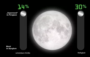 Am 14. November erwartet uns ein besonders beeindruckender Anblick. Denn an diesem Tag fällt der Vollmond fast genau mit dem erdnächsten Punkt der Mondbahn, dem sogenannten Perigäum, zusammen. Dadurch erscheint der Vollmond bis zu 30 Prozent heller und bis zu 14 Prozent größer am Nachthimmel als normal.