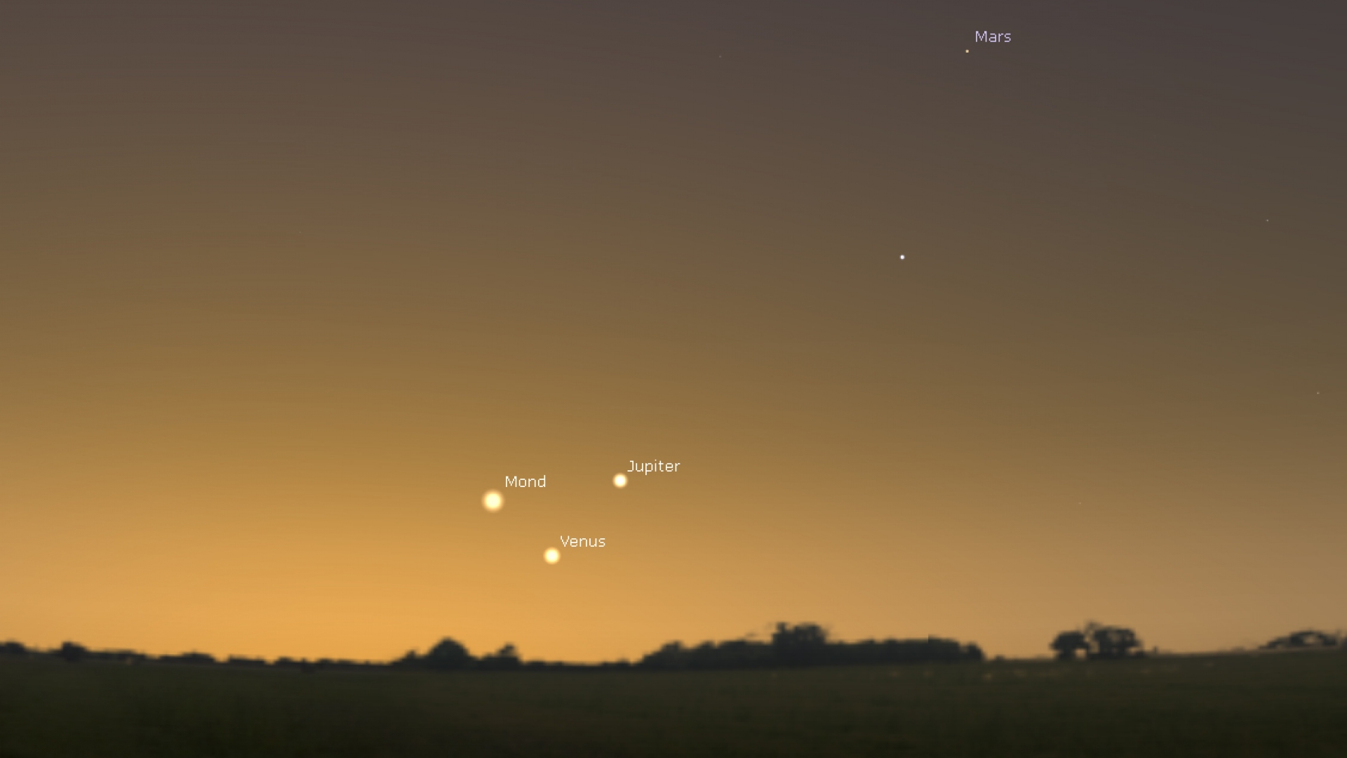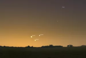 Mitte November gesellt sich dann der König der Planeten hinzu: der Jupiter. Er hat am 14. November direkt ein sehr enges Rendezvous mit der Venus, beide stehen dann vor Sonnenaufgang nur 17 Bogenminuten auseinander – das entspricht nur dem halben Monddurchmesser. Gleichzeitig wandert die dünne Mondsichel ganz nah am etwas weiter oben stehenden Mars vorbei. Am 17. November – unmittelbar vor Neumond – kommt es sogar zu einem Dreiertreffen: Die hauchdünne Mondsichel bildet dann kurz vor der Morgendämmerung ein Dreieck mit Venus und Jupiter.