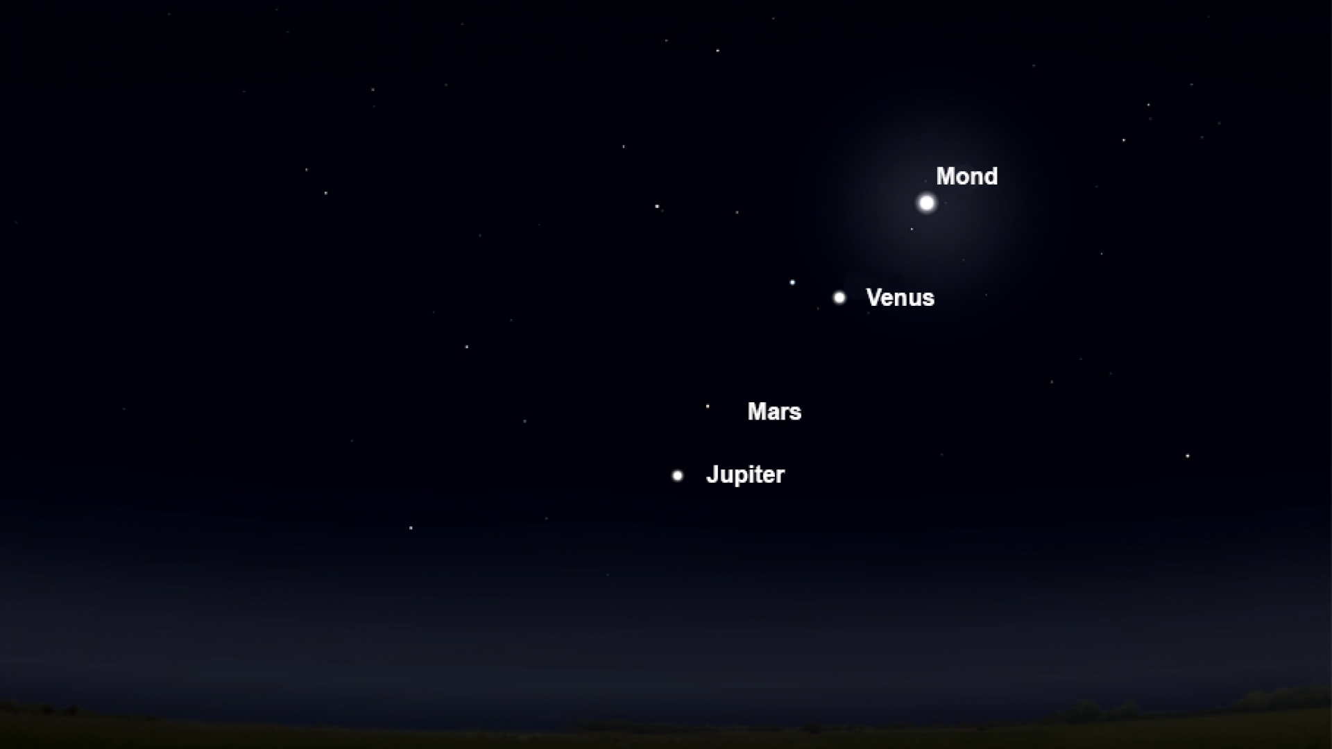 Zwischen dem 8. und 10. Oktober reiht sich gegen sechs Uhr morgens auch der Mond mit ein. Er steht erst über der Venus, einen Tag später zwischen ihr und dem Mars und dann schließlich als unterster der Reihe knapp unter Jupiter. Ab dem 10. Oktober gesellt sich sogar der Planet Merkur mit dazu: Er steht ganz tief über dem Horizont und bildet damit den Abschluss dieser eindrucksvollen Planetenparade.