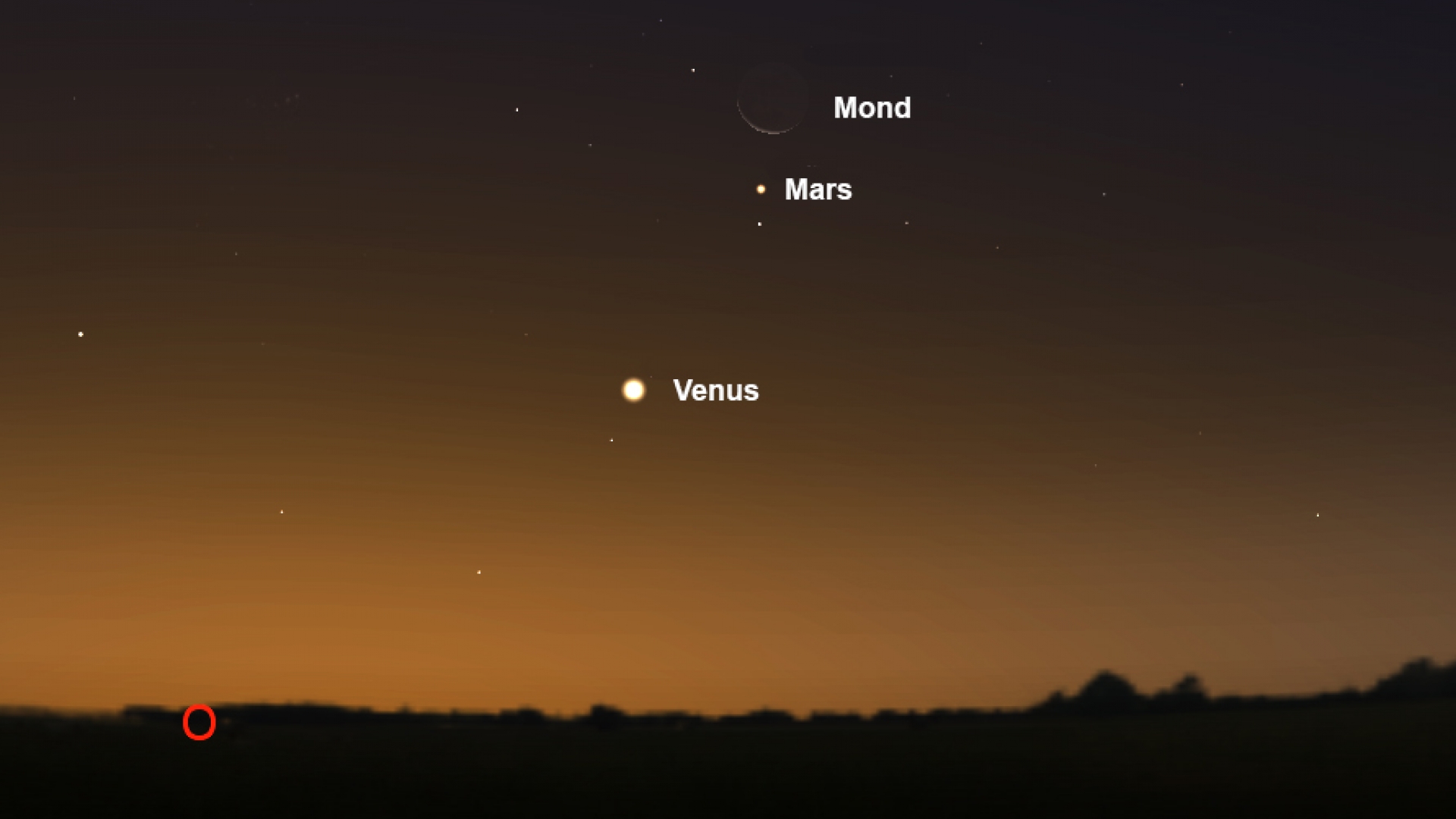 Am Morgen des 16. und 17. Oktober haben Mars, Venus und Mond ein besonders attraktives Stelldichein: Die helle Venus steht dann nur rund drei Fingerbreit links unter dem Mars. Die schmale Sichel des abnehmenden Mondes zieht am 16. Oktober dicht oberhalb dieses Zweierteams vorbei. Am 17. Oktober wiederholt sich diese Passage mit der Mondsichel unterhalb der beiden Planeten.