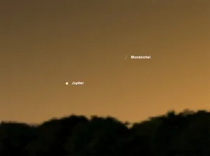 Ebenfalls lohnend anzuschauen sind in diesem Monat einige nahe Begegnungen des Mondes mit anderen Objekten am Himmel. Am Abend des 11.Oktober, kurz nach Neumond, zieht die schmale Sichel des zunehmenden Mondes dicht am hellen Gasriesen Jupiter vorbei. Die Sichel steht dann nur zwei Fingerbreit rechts vom Jupiter. Am 14. Oktober setzt der Mond seine Planetentour fort: Diesmal steht er nur drei Fingerbreit neben dem Ringplaneten Saturn. Wenige Tage später, am 17. Oktober, passiert der Mond dann auch noch unseren Nachbarplaneten Mars.