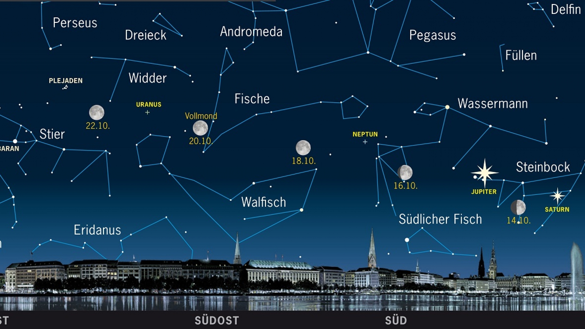 Gegen 21:00 Uhr sind auch die beiden fernen äußersten Planeten Uranus und Neptun am Himmel sichtbar – allerdings nur von dunklen Standorten aus und mit einem guten Fernglas oder kleinen Teleskop. Ab 20. Oktober hat auch der innerste Planet Merkur einen kurzen Auftritt. Nachdem er momentan noch zu nah an der Sonne steht, um aus ihrem Strahlen herauszutreten, wandert er in den nächsten Wochen bis zum von uns aus gesehen seitlichsten, sonnenfernsten Punkt seiner Bahn. Dadurch wird er immer besser sichtbar und heller und leuchtet kurz vor Sonnenaufgang am östlichen Horizont.