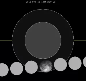 Gut zwei Wochen später ereignet sich die nächste Finsternis - diesmal des Mondes. Der Erdtrabant wandert am 16. September 2016 durch den Schatten der Erde. Dabei jedoch zieht er nicht zentral durch den Kernschatten hindurch, sondern passiert nur den dämmrigen Bereich des Halbschattens. Der Mond wird sich daher nicht spektakulär verfinstern oder rot aufscheinen wie bei einer totalen Mondfinsternis. Er wird nur ein klein wenig dunkler.